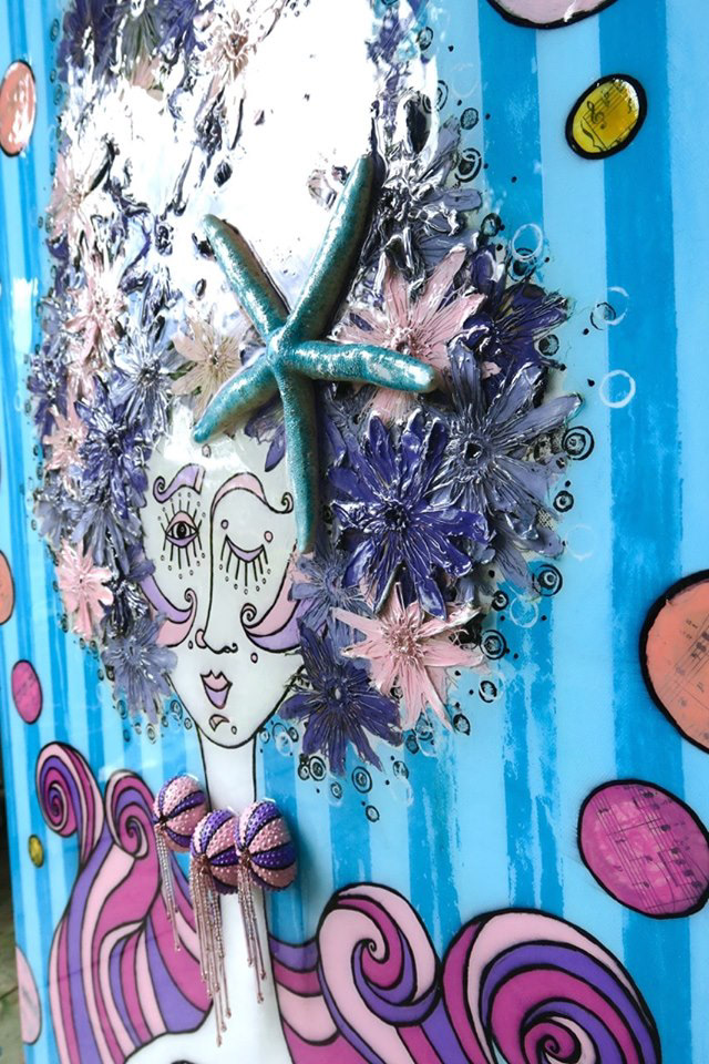 "Agave, The Sea Nymph (Nereid Known As 'The Illustrious')" Acrylic, Ink, Antique Sheet Music c.1880s, Starfish, Sea Urchins, Shells, Antique Glass Beads, with Glossy Resin Glaze (shines like glass) on Canvas, 24x48x3"