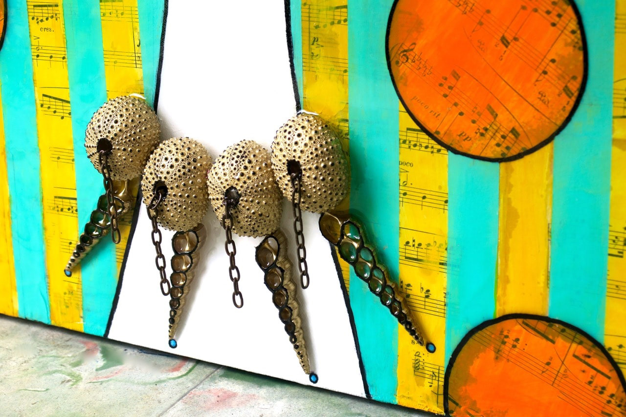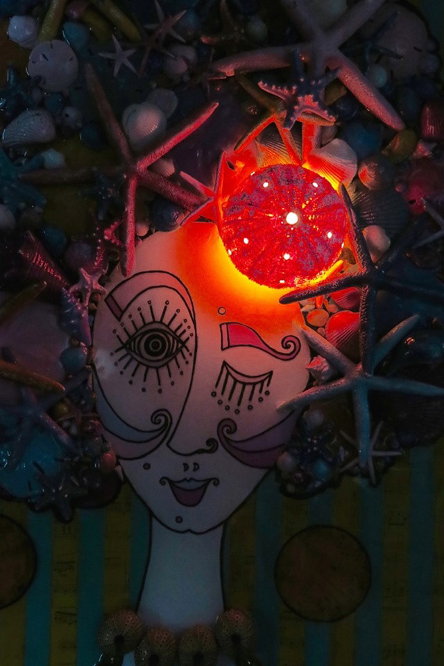 "Amphitrite, Queen of the Sea (Wife Of Poseidon)" Acrylic, Ink, Antique Sheet Music c.1880s, Large Sea Urchin (that lights up💡), Starfishes, Antique Clock Chain c.1890s, Sand Dollars, Various Shells, with Glossy Resin Glaze (shines like glass) on Canvas, 30x40x5"
