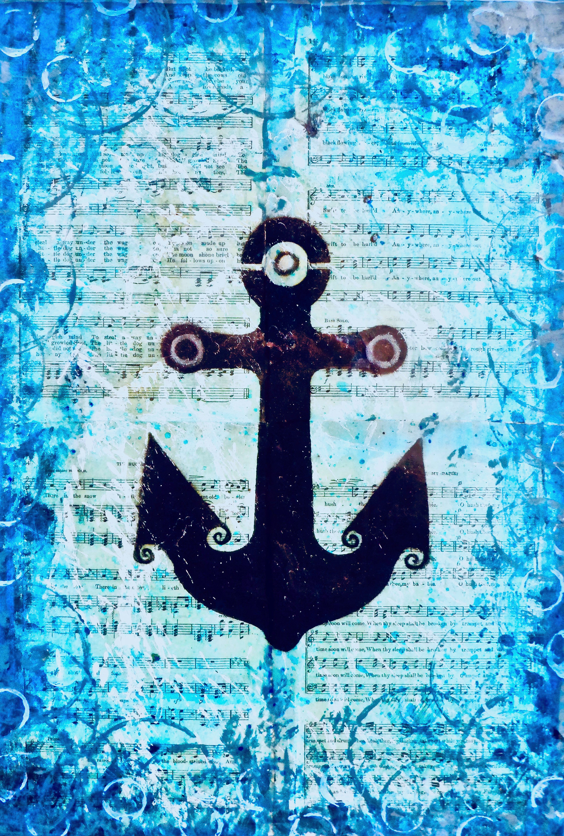 "Anchored" Acrylic, Ink, Antique Sheet Music c.1880s, Resin (shines like glass) on Canvas, 16x20x2"