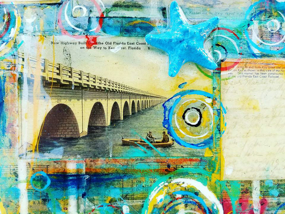 "Homage To Key West Suite: Vol. II" ~ Acrylic, Ink, Antique Postcards & Photographs of Key West c.1896 to 1967, Antique Sheet Music & Prints from the late 1800s, Real Flowers & Starfish with Glossy Resin Glaze (shines like glass) on Canvas, 30 x 30 x 2" (Sold)