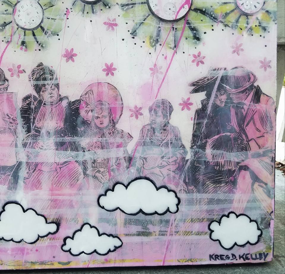 "Memento Vivere (Remember To Live) Suite: Key West : Vol. I" Acrylic, Ink, Antique Clocks c.1890s, Antique Postcards & Photographs of Key West c.1896 to 1967, Antique Sheet Music & Prints from the late 1800s, Butterflies & Starfish with Glossy Resin Glaze (shines like glass) on Canvas, 22 x 28 x 2" (Sold, Private Collection, Key West, Fl)