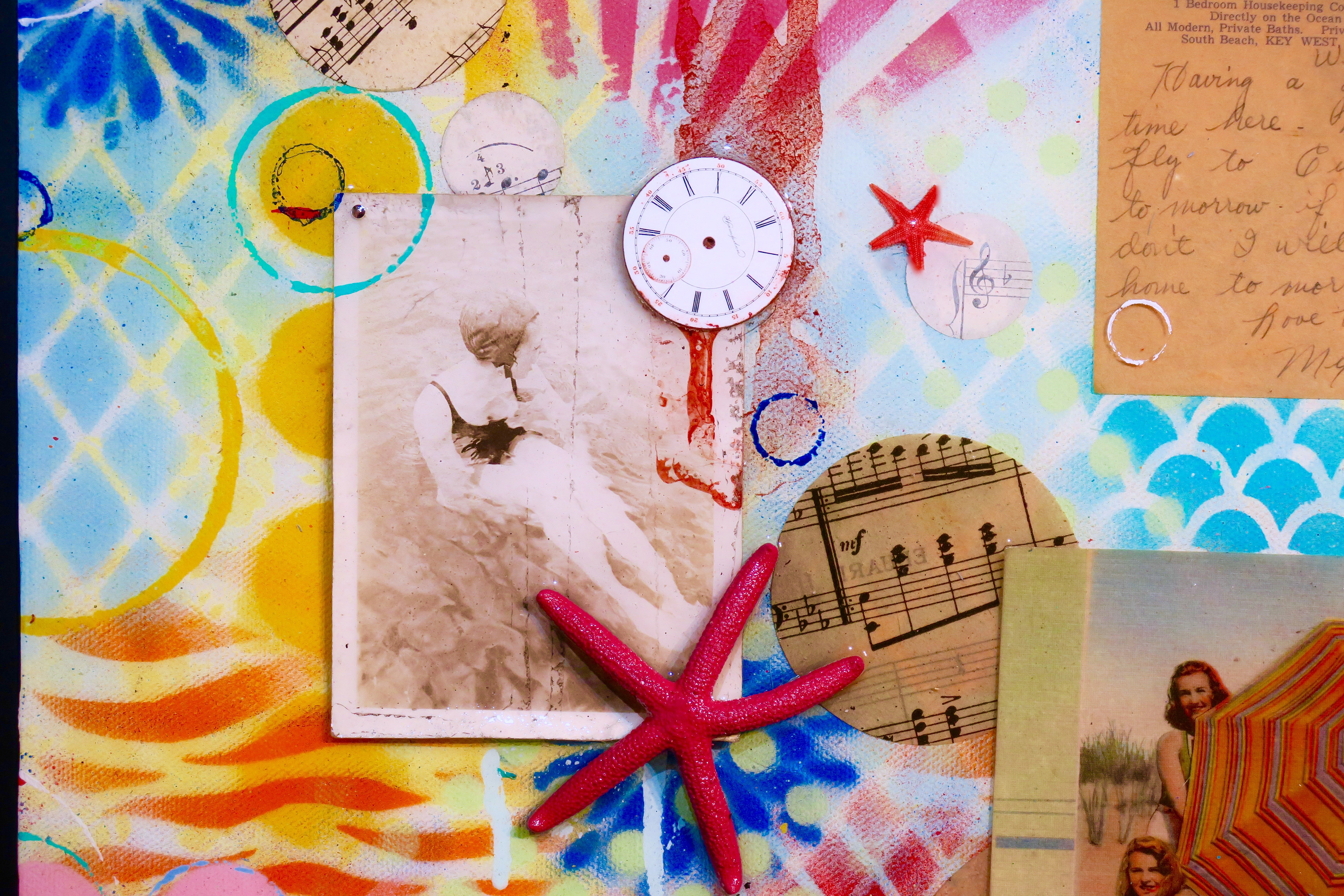 "Memento Vivere (Remember To Live) Suite: Key West : Vol. XIV" Acrylic, Pastel, Ink, Antique Photographs & Postcards circa late 1800s to early/mid 1900s, Antique Sheet Music c.1870s, Antique Porcelain Pocket Watch Dials c.1890s, Real Butterflies, Flowers, Starfish, on Canvas with Glossy Resin Glaze (shines like glass), 22 x 28 x 3”