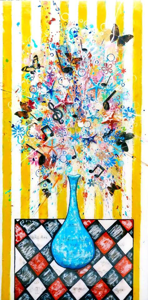 "Flower Splash Suite: Vol. VII" Acrylic, Pastel, Ink, Paper Mache (vase & flowers pop off canvas 1/2"), Antique Sheet Music c.1879, with Glossy Resin Glaze (shines like glass) on Canvas, 10 x 12" (Hanging in the Borderstan Office; Collection of Matthew Rhoades & Luis Armando Gomez- Washington, DC)