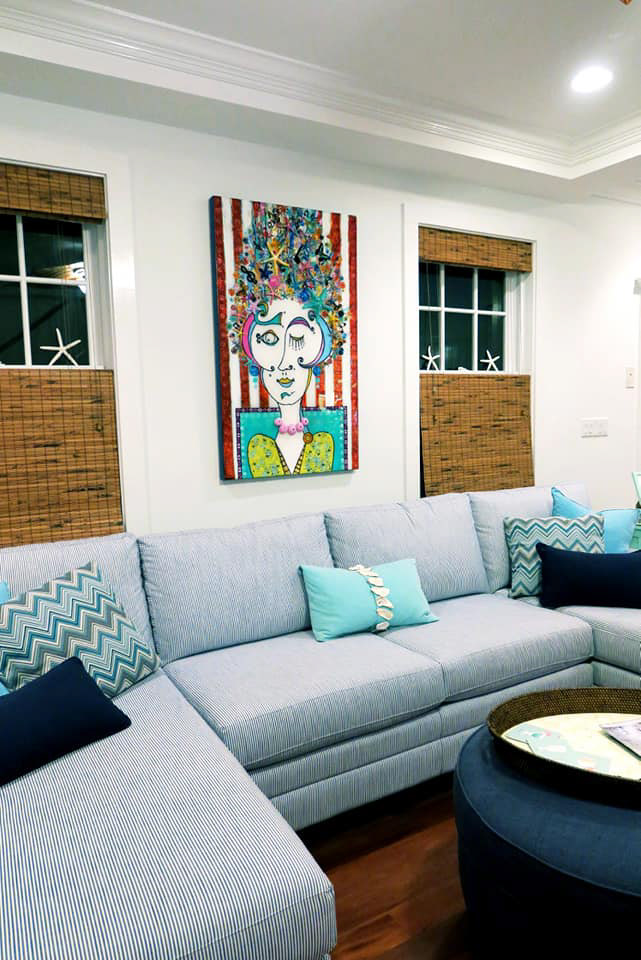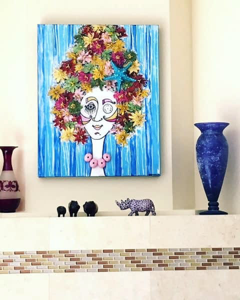 “Doris, The Sea Nymph” Acrylic, Ink, Pastel, Antique Porcelain Clock Dial c.1890s (eye), Dried & Painted Passion Flowers (hair), Sea Urchins (necklace), Starfish, on Canvas with Glossy Resin Glaze (shines like glass) 24x30x4" (Sold - Private Collection, Fort Lauderdale, FL)