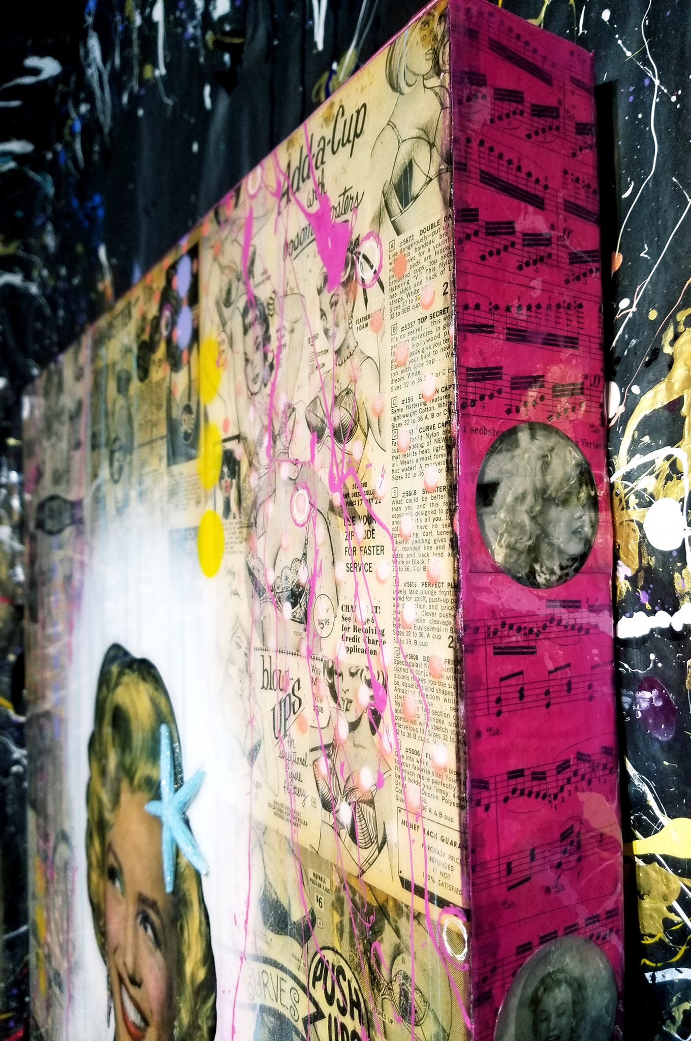 Acrylic, Ink, c.1959 Original Catalogue Pages from Frederick's Of Hollywood, Vintage Photos, Antique Sheet Music c.1890s (sides), Starfish, Diamond Dust (dress, earrings, starfish twinkle) with Glossy Resin Glaze (shines like glass) on Canvas, 24 x 30 x 2.5”