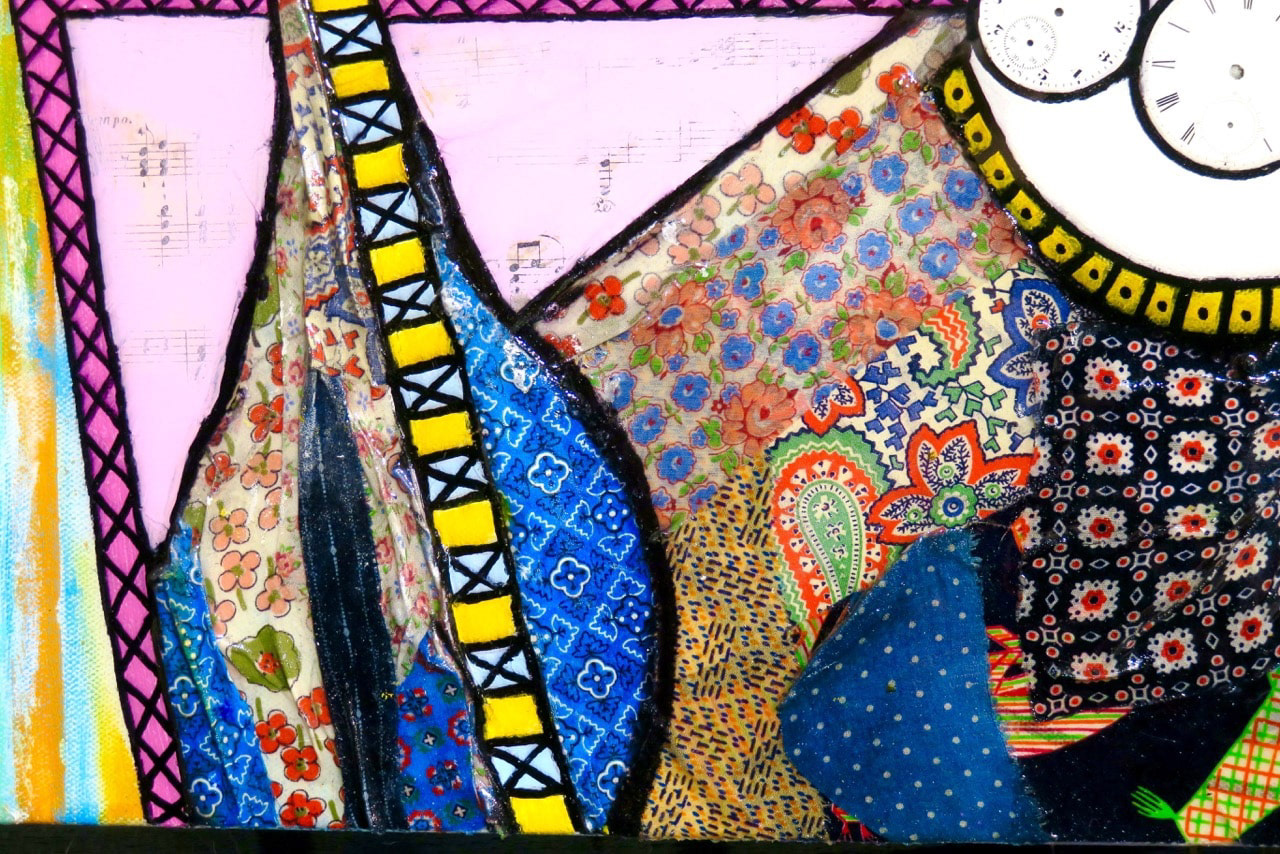 "Clair Voyant” Acrylic, Ink, Pastel, Antique Porcelain Clock Dials c.1890s (necklace), Over 100 Antique Dice (hair), Antique Sheet Music c.1870s (clouds, chair, moon), Antique Skeleton Key c.1880s (wand), Antique Cloth Scraps c.1930s (dress), Butterflies, on Canvas with Glossy Resin Glaze (shines like glass) 24x48x4" (Sold - On Permanent Display @ The Roost, Key West, FL)