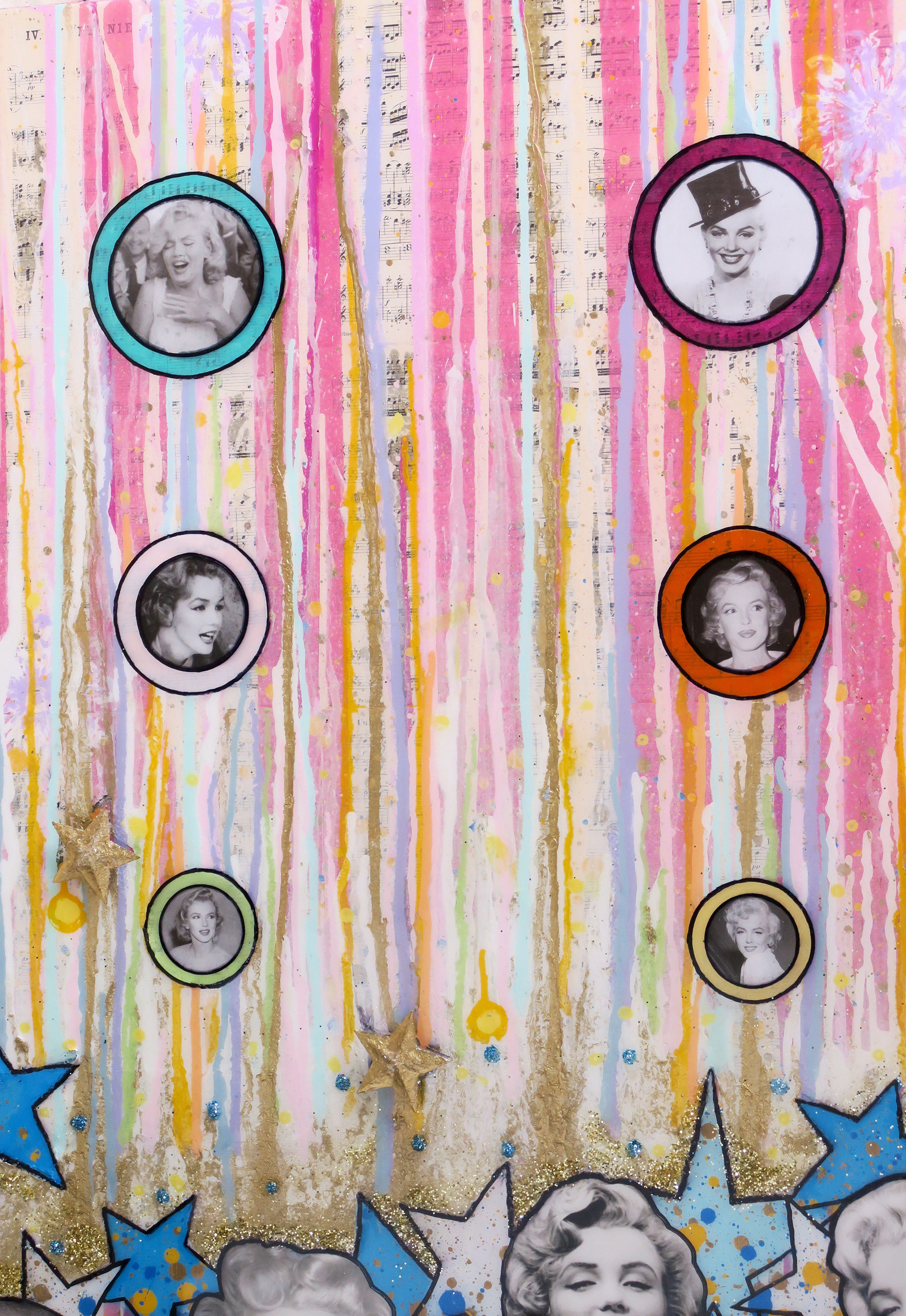 "Fucking Beautiful" Acrylic, Ink, Neon Light ("Fucking Beautiful" lights up pink, floating 2"), Antique Sheet Music c.1893 of Beethoven's 'Symphony I' (background), Metal (star floating 2"), Diamond Dust (twinkle effect) with Glossy Resin Glaze (shines like glass) on Aluminum, 37 x 64.5 x 4” SOLD