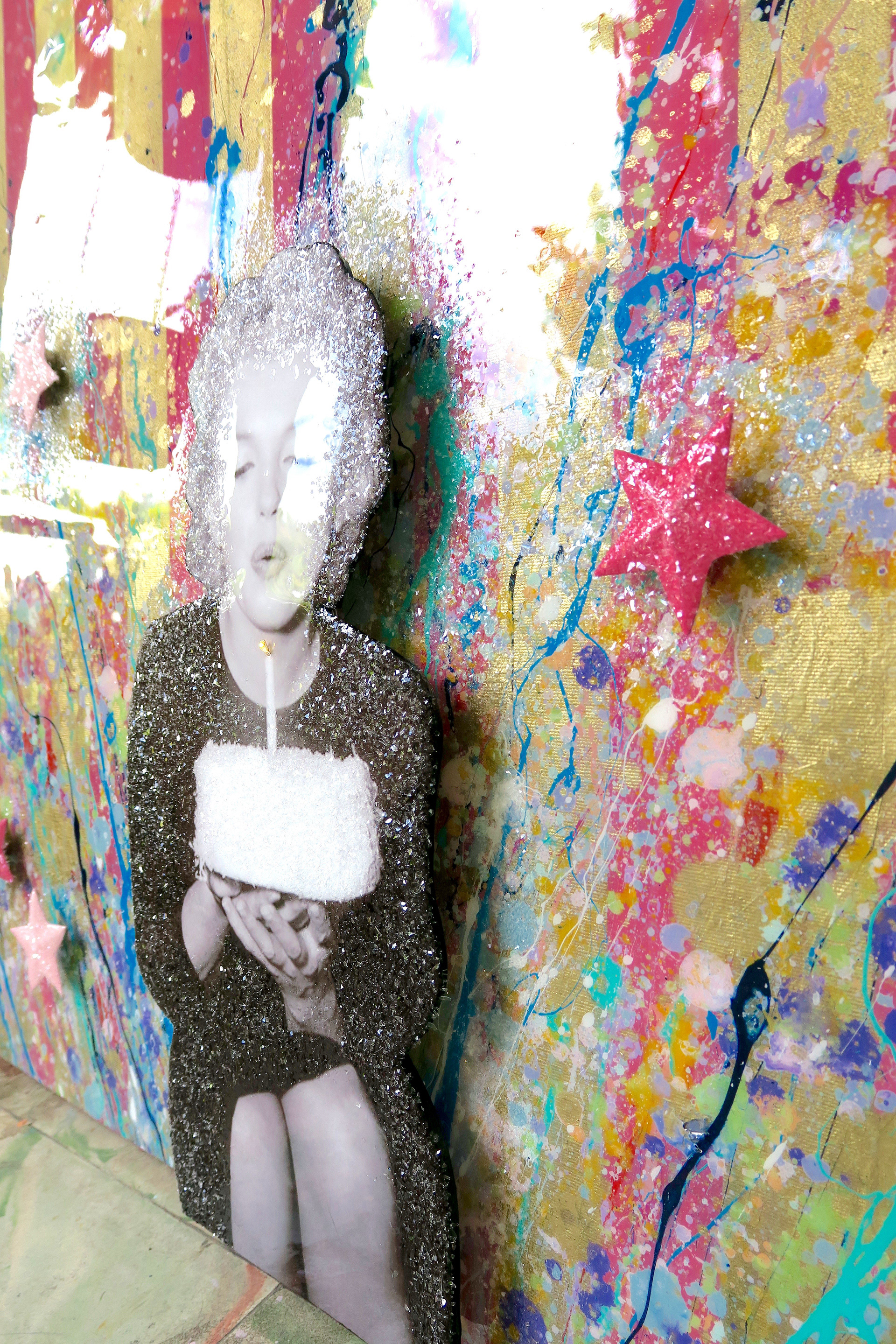 "Happy Birthday, Marilyn" Acrylic, Ink, LED Light (candle flame & behind Marilyn lights up), Photograph from June 1st, 1956 on her 30th (floating 2"), Metal Stars (floating 2"), Diamond Dust (twinkle effect) with Glossy Resin Glaze (shines like glass) on Canvas, 24 x 28 x 2” SOLD