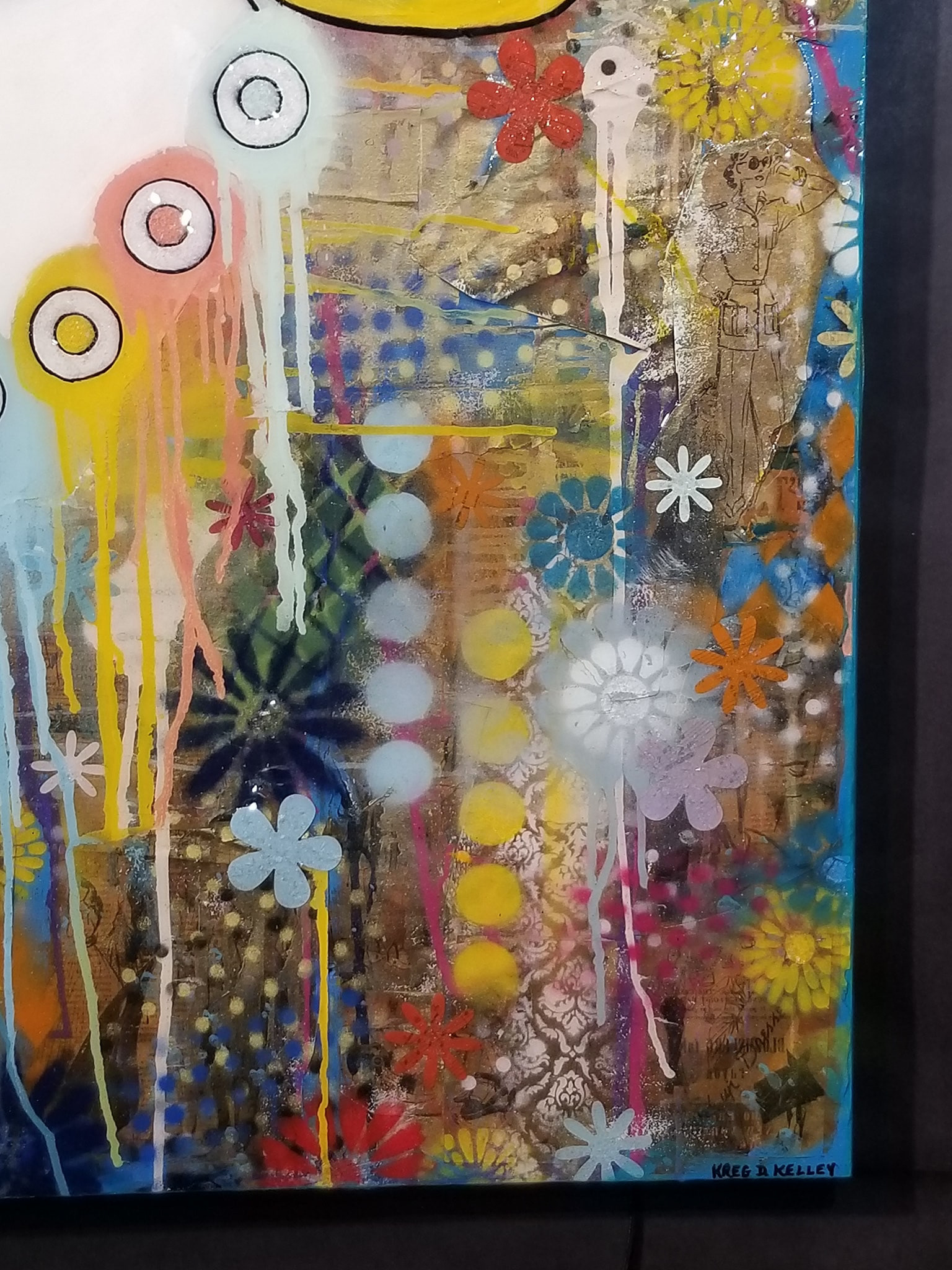 "Island Girl" Acrylic, Ink, c.1950s Original Fashion Catalogue Pages (background), Neon Light (flower in hair), Antique Sheet Music c.1890s (flowers/sides), Diamond Dust (eyelids, necklace, background flowers) with Glossy Archival ArtResin Glaze (shines like glass) on Aluminum Backing, 34 x 60 x 1.5”