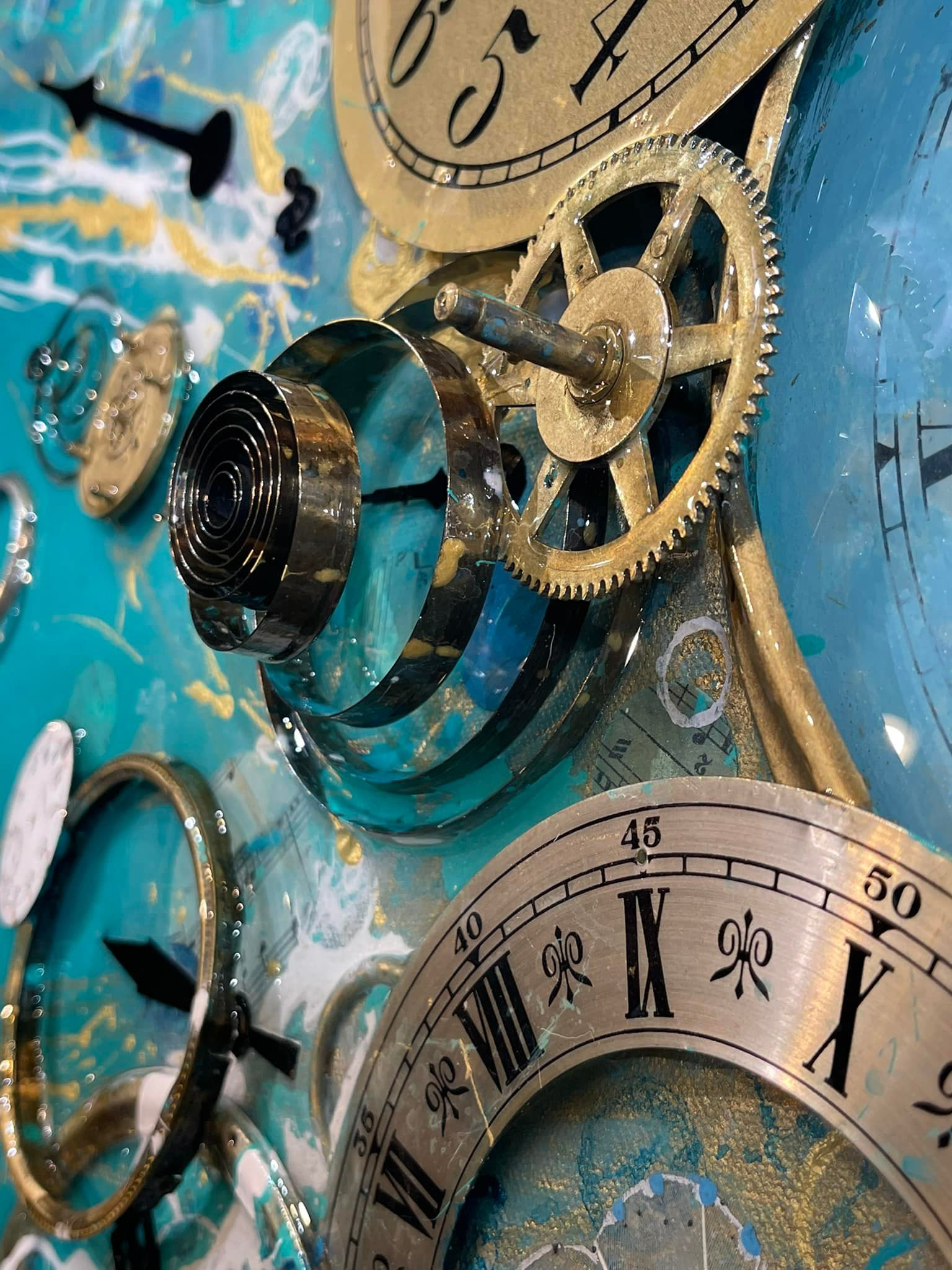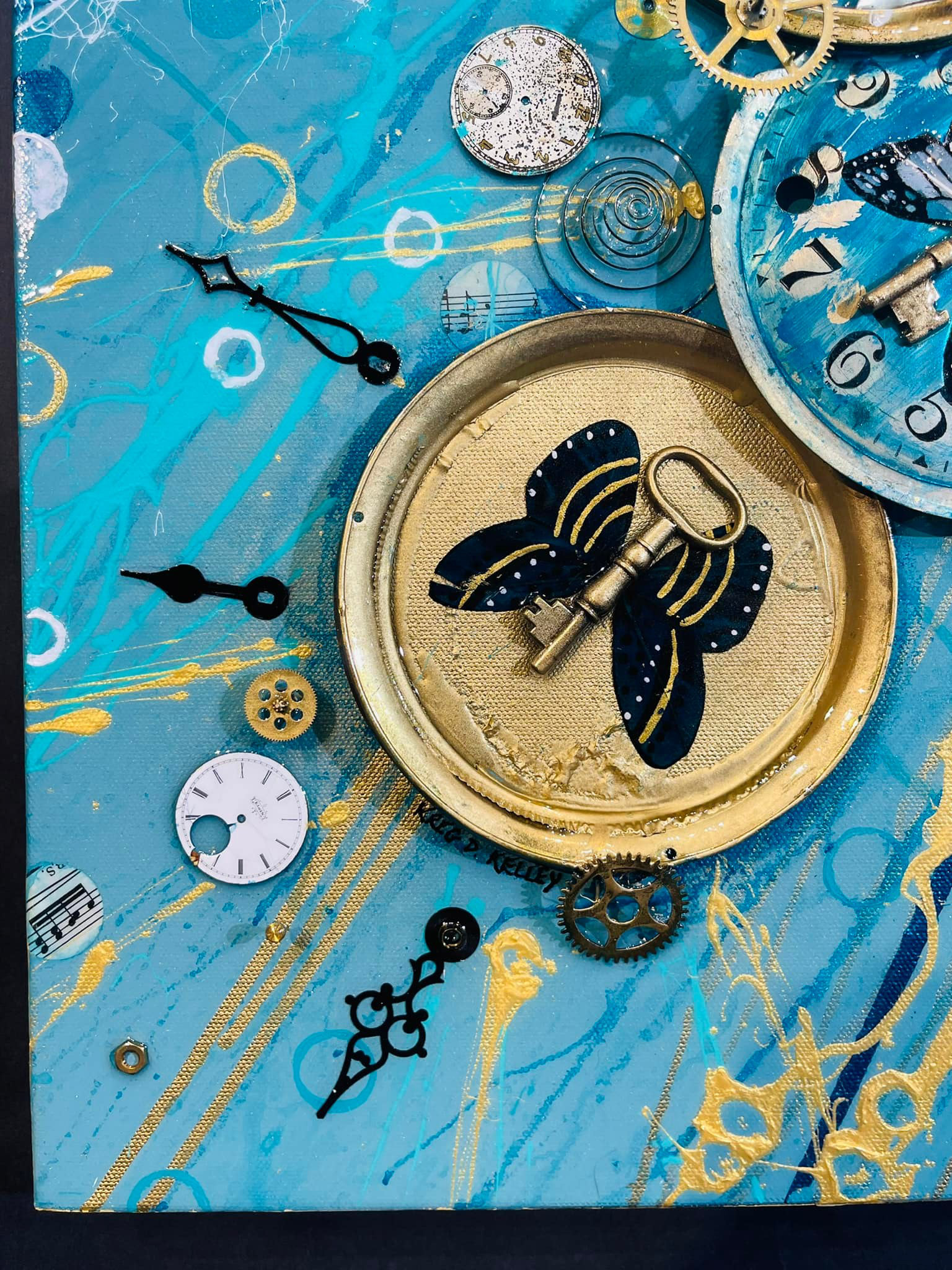 "Tempus Fugit (Time Flies) Suite: Vol. CV" Acrylic, Ink, Gold Leaf, Antique Clock & Watch Parts (springs, dials, bezels, hands, gears, pendulums, cogs, gongs, etc) c.late 1800s to early 1900s, Antique Sheet Music c.1800s to early 1900s, Painted Feathers (Butterflies), Antique Skeleton Keys c.1800s-1900s, Glossy Epoxy Archival ArtResin Glaze (shines like glass), On Canvas, 30 x 40 x 3" SOLD