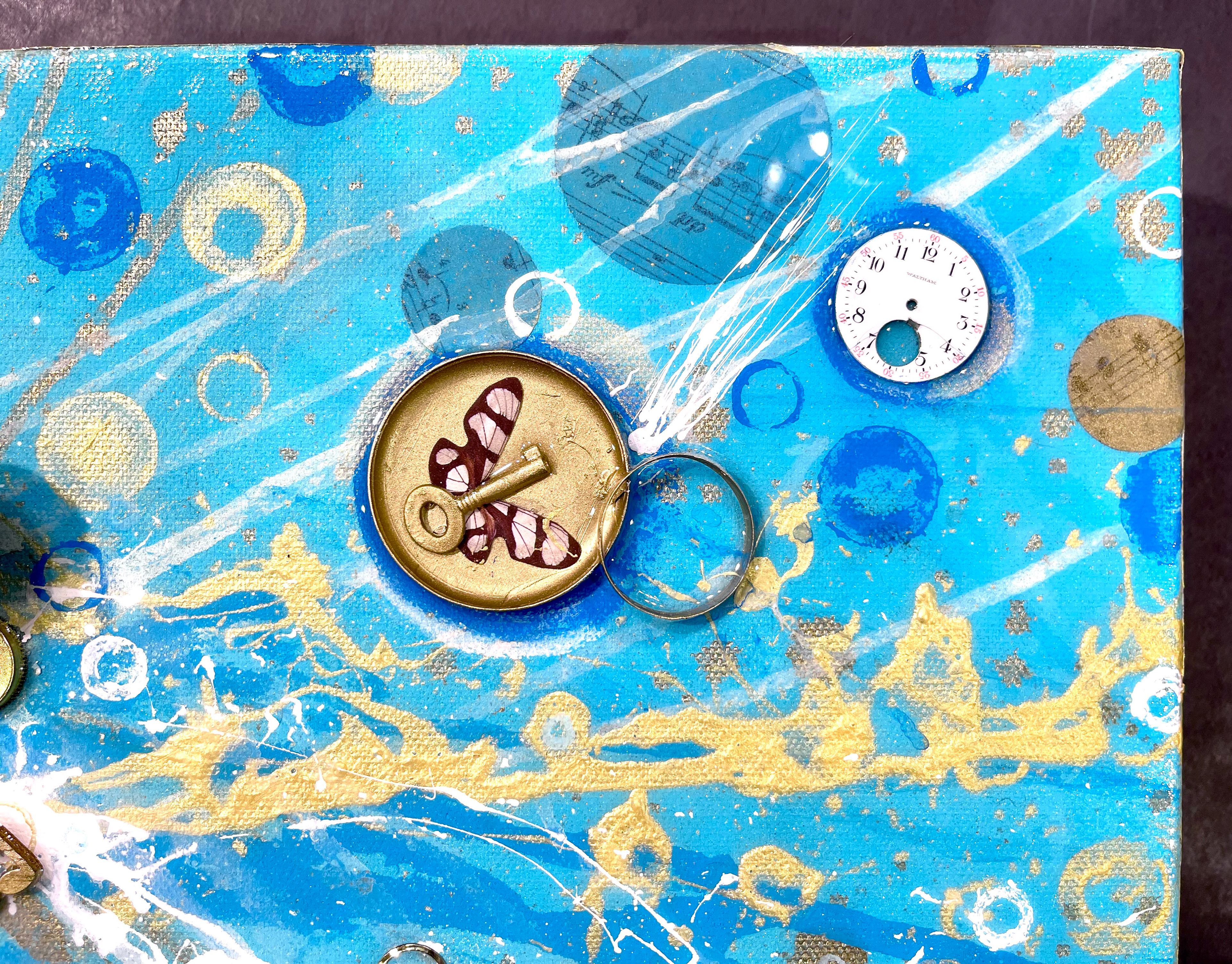 Acrylic, Ink, Antique Clocks & Porcelain Pocket Watch Parts, Sheet Music & Skeleton/Clock Keys c.1800s - early 1900s, Butterflies (hand painted feathers/paper), Battery Operated Clock Hands (working clock mechanism) with Glossy Archival ArtResin Glaze (shines like glass) on Canvas,