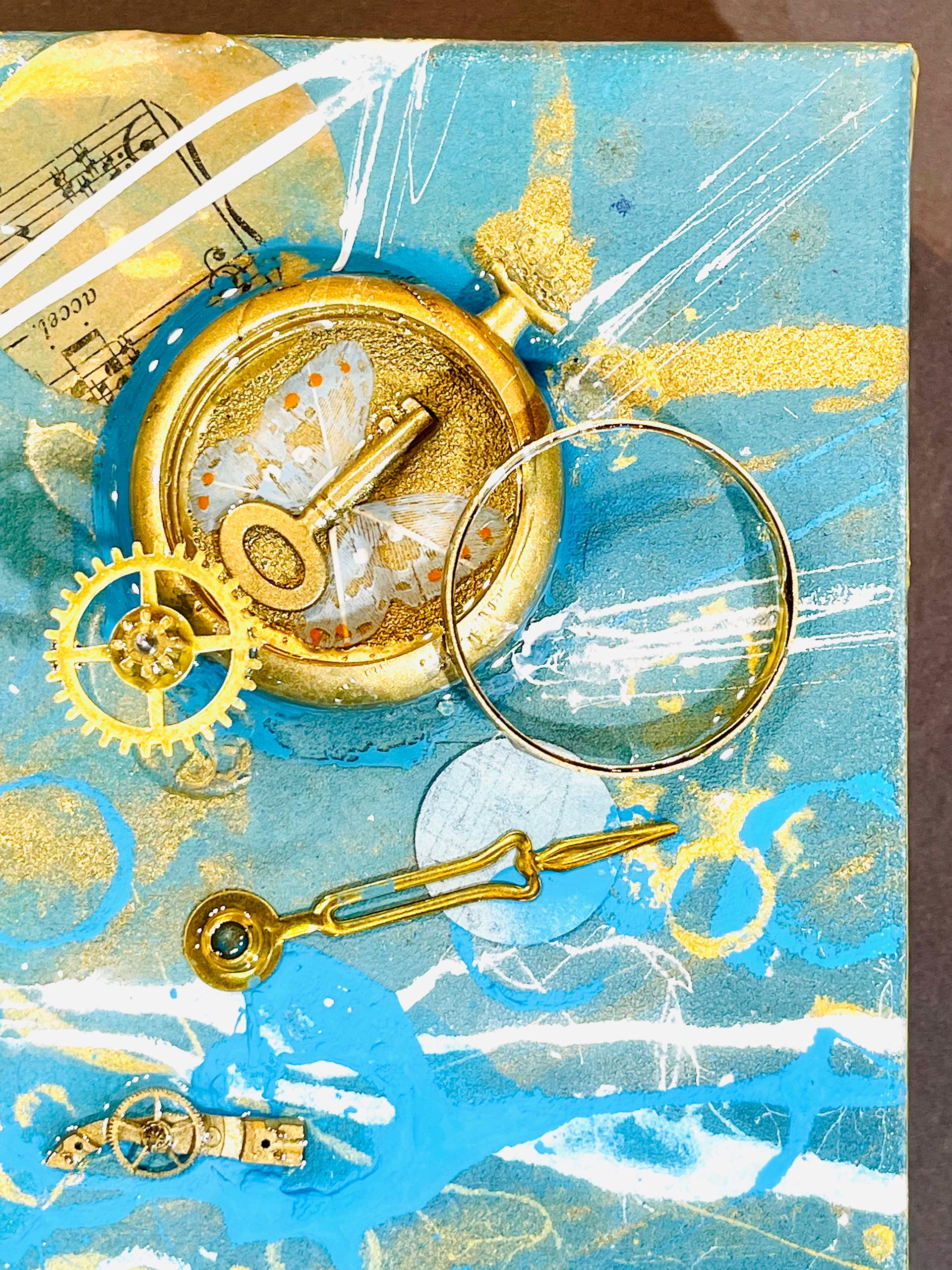 Acrylic, Ink, Antique Clocks & Porcelain Pocket Watch Parts, Sheet Music & Skeleton/Clock Keys c.1800s - early 1900s, Butterflies (hand painted feathers/paper), Battery Operated Clock Hands (working clock mechanism) with Glossy Archival ArtResin Glaze (shines like glass) on Canvas,
