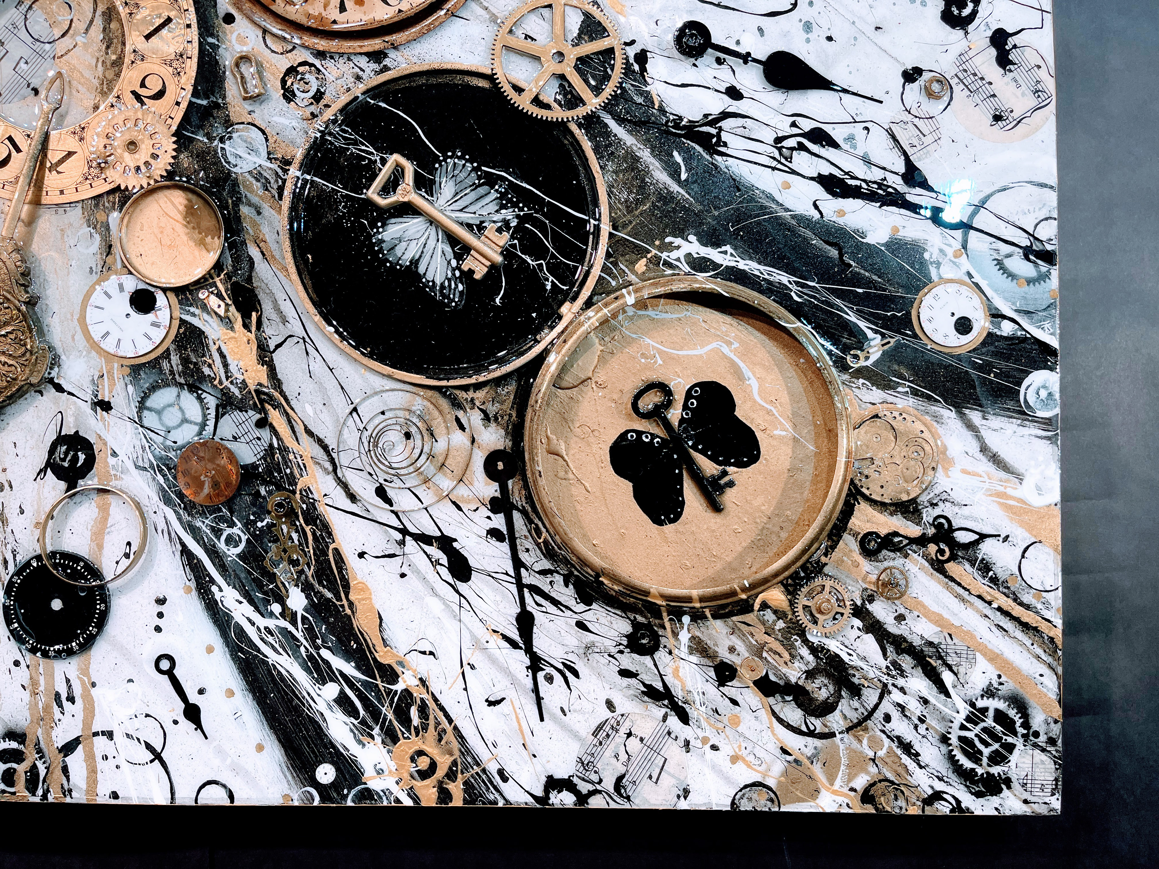 "Tempus Fugit (Time Flies) Suite: Vol. LIX" Acrylic, Ink, Gold Leaf, Antique Clock & Watch Parts (springs, dials, bezels, hands, gears, pendulums, cogs, etc) c.late 1800s to early 1900s, Antique Sheet Music c.1800s to early 1900s, Painted Feathers (Butterflies), Antique Skeleton Keys c.1800s-1900s, Glossy Epoxy Archival ArtResin Glaze (shines like glass), On Wood Panel, 36 x 36 x 3" SOLD