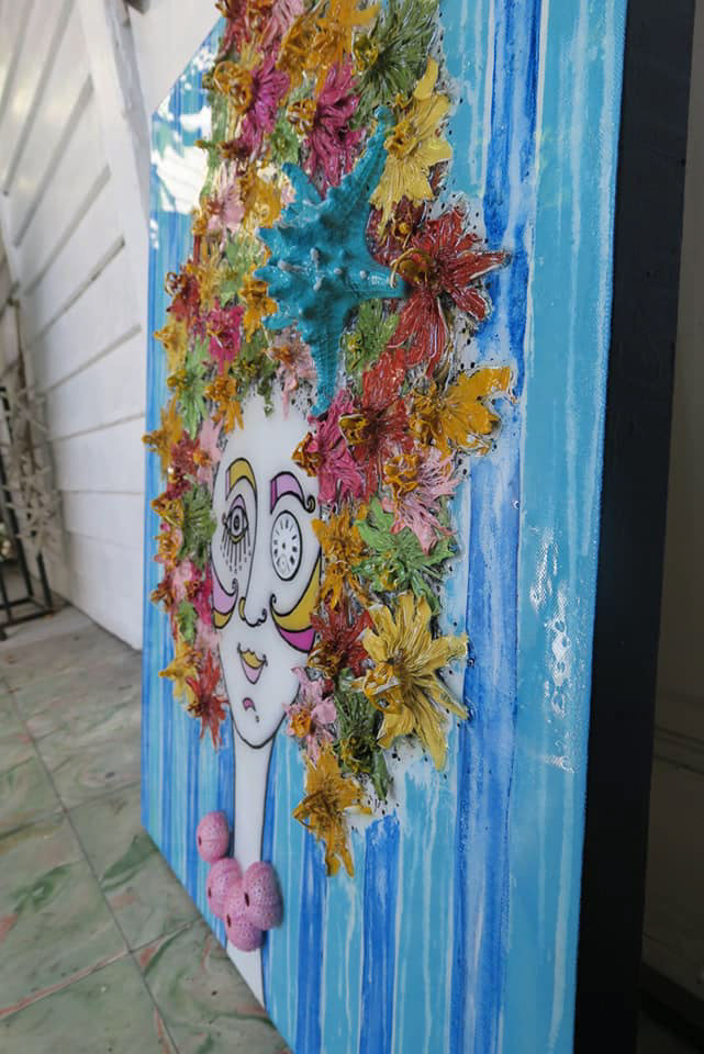 “Doris, The Sea Nymph (Mother Of The Nereids)” Acrylic, Ink, Pastel, Antique Porcelain Clock Dial c.1890s (eye), Dried & Painted Passion Flowers (hair), Sea Urchins (necklace), Starfish, on Canvas with Glossy Resin Glaze (shines like glass) 22x28x4" (Sold)