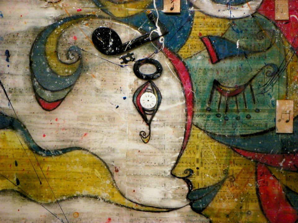 “Eurydice, the Nymph” Acrylic, Ink, Pastel, Antique Sheet Music from c.1877, Piano Parts from c.1898, Real Butterflies & Flowers, Antique Victorian Tintype of 3 Women from c.1888, Antique Clock Face from c.1882, on Canvas with Glossy Glaze, 40 x 30 x 3”(Sold)