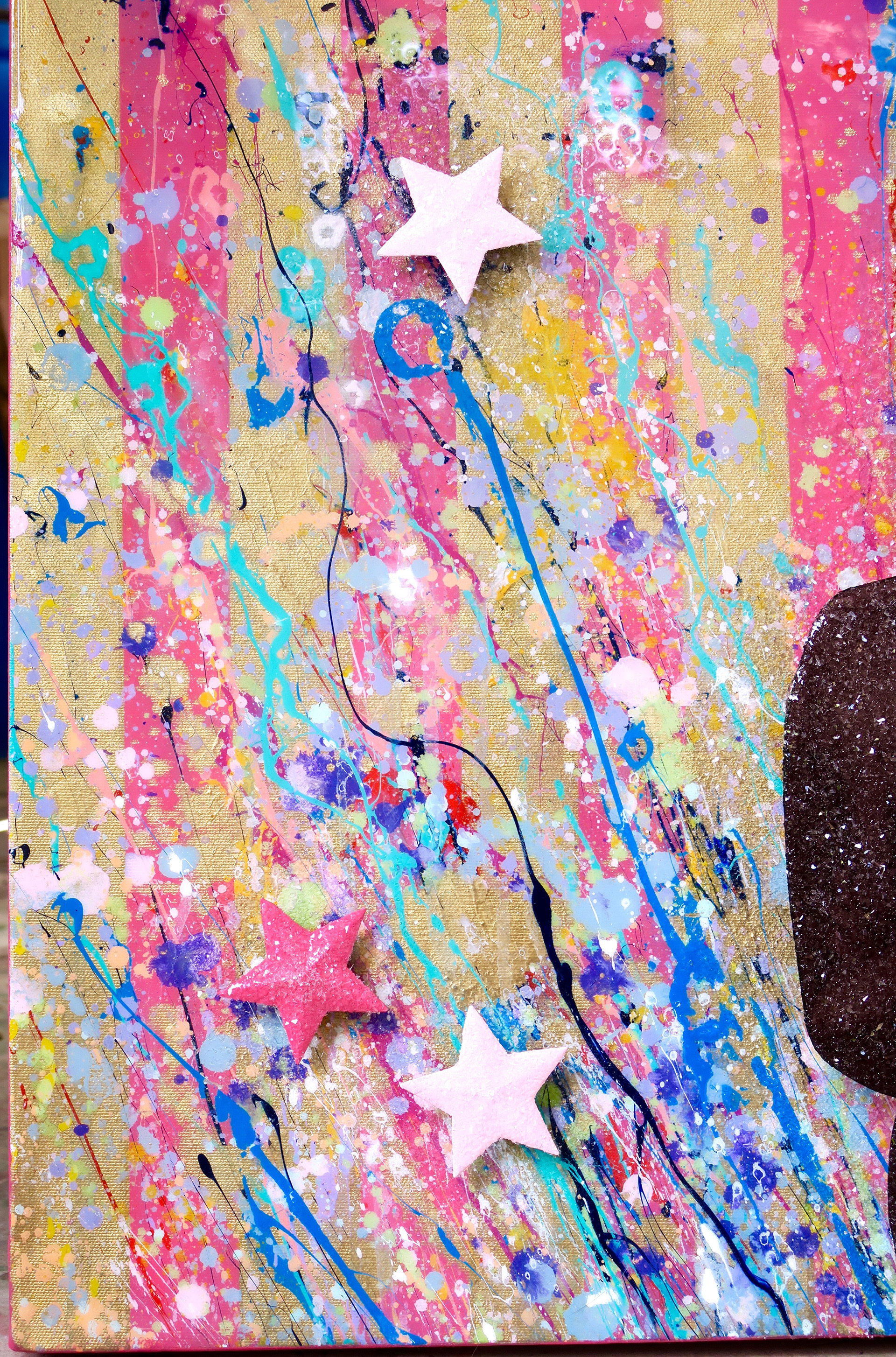 "Happy Birthday, Marilyn" Acrylic, Ink, LED Light (candle flame & behind Marilyn lights up), Photograph from June 1st, 1956 on her 30th (floating 2"), Metal Stars (floating 2"), Diamond Dust (twinkle effect) with Glossy Resin Glaze (shines like glass) on Canvas, 24 x 28 x 2” SOLD