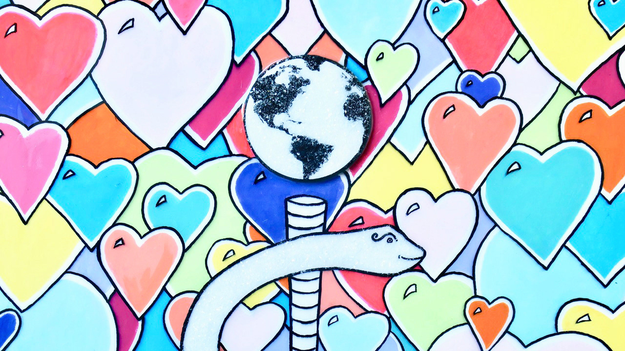 "Heroes" (The Rod Of Asclepius) Acrylic, Ink, Diamond Dust (globe & snake twinkle), Paper Mache (globe pops off canvas 1/4 inch), with ArtResin Glaze (entire piece shines like glass) on Canvas, 22 x 28 x 2"