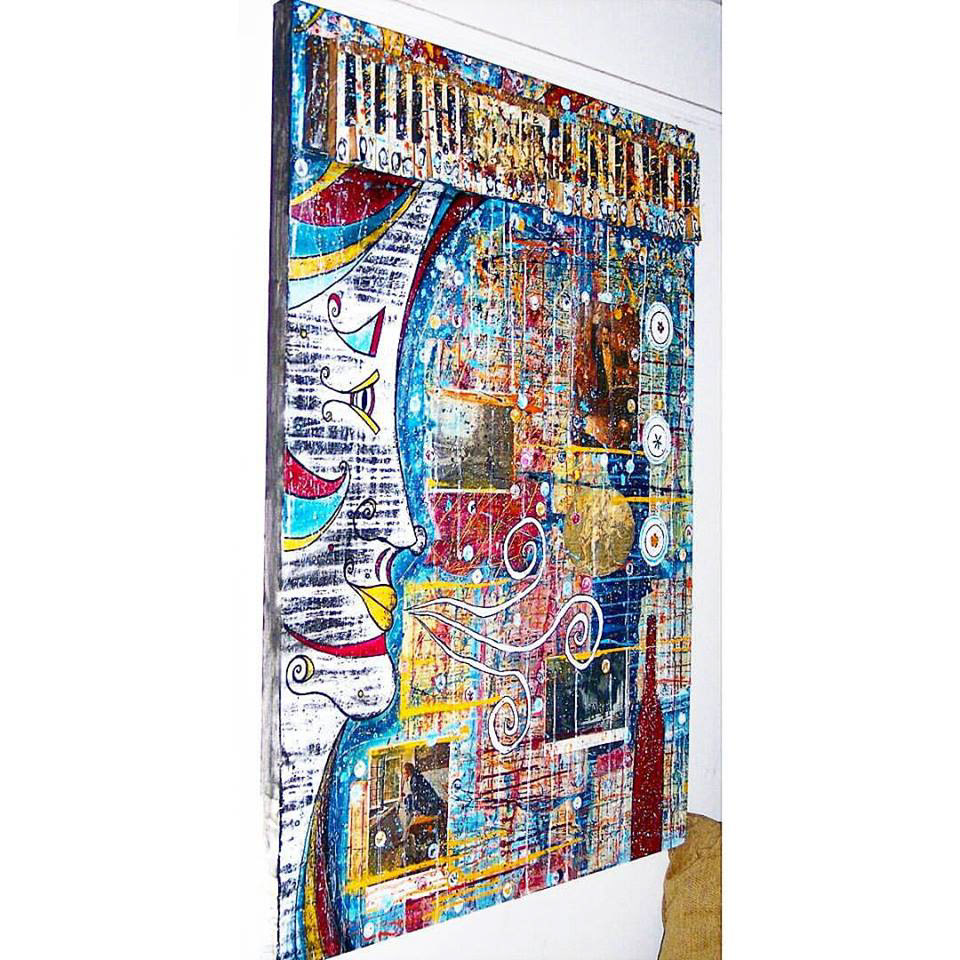 "Homage To Beethoven" Acrylic, Ink, Pastel, Antique Piano Keys c.1930s, Paper Mache, Dried & Pressed Flowers, Antique Prints c.1800s, with Glossy Resin Glaze (Shines like glass) on Canvas c.2008, 30 x 40 x 5" (Sold)