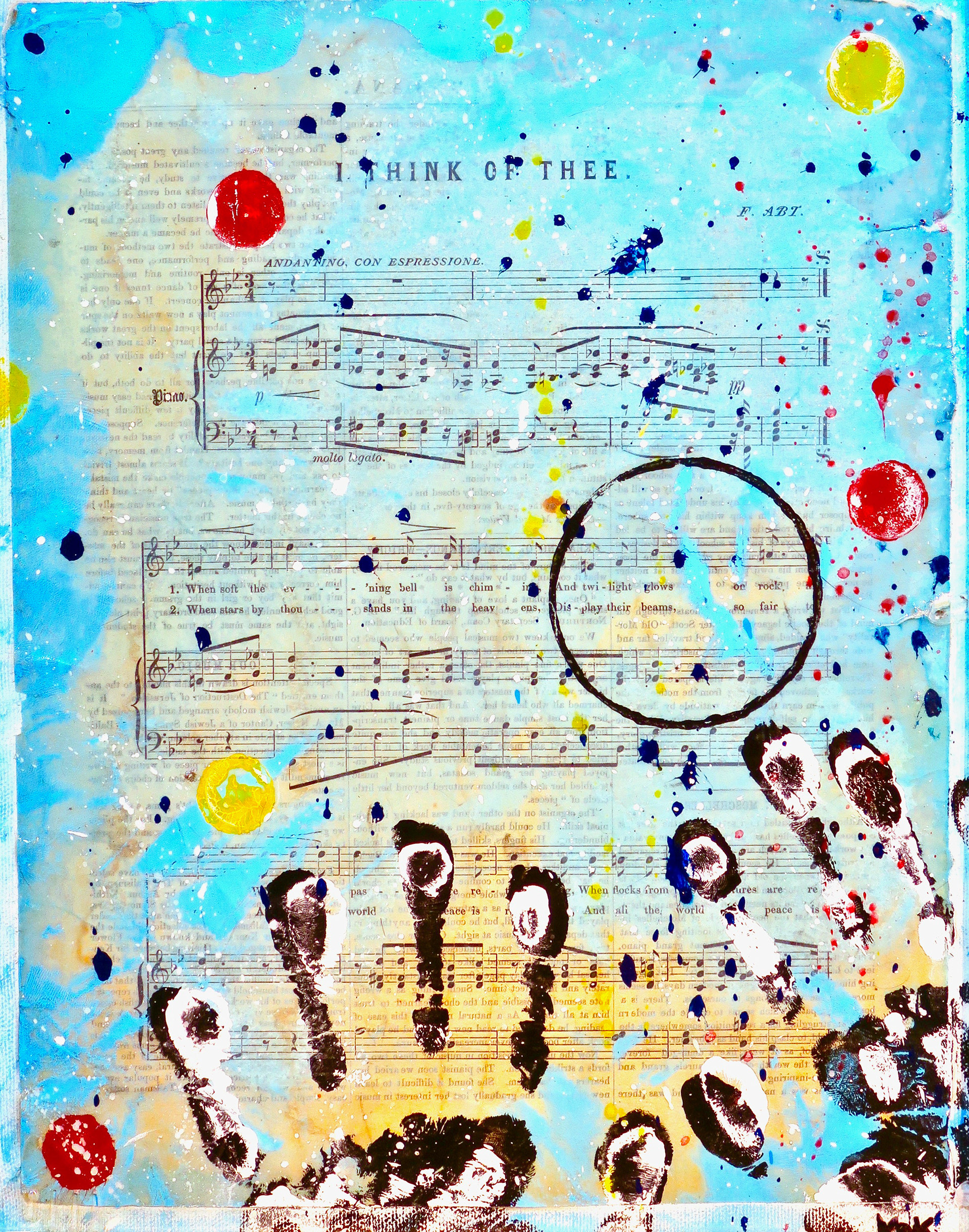 "I Think Of Thee" Acrylic, Ink, Antique Sheet Music c.1860s, with Glossy Resin Glaze (shines like glass) 10x13x1"