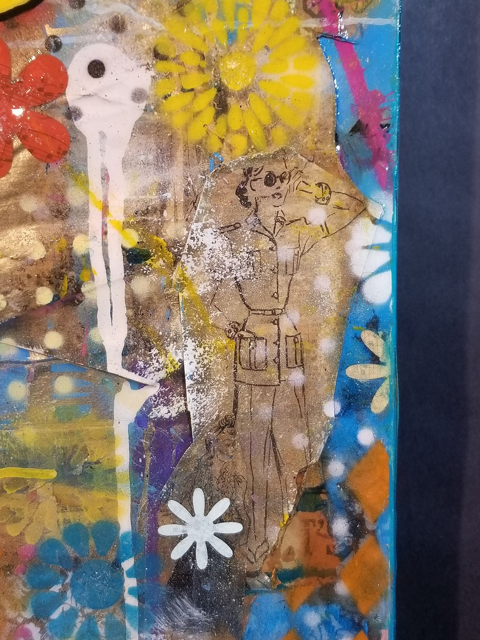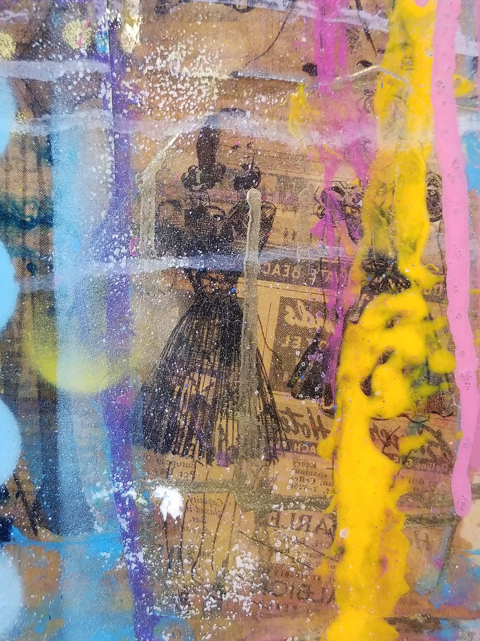 "Island Girl" Acrylic, Ink, c.1950s Original Fashion Catalogue Pages (background), Neon Light (flower in hair), Antique Sheet Music c.1890s (flowers/sides), Diamond Dust (eyelids, necklace, background flowers) with Glossy Archival ArtResin Glaze (shines like glass) on Aluminum Backing, 34 x 60 x 1.5”