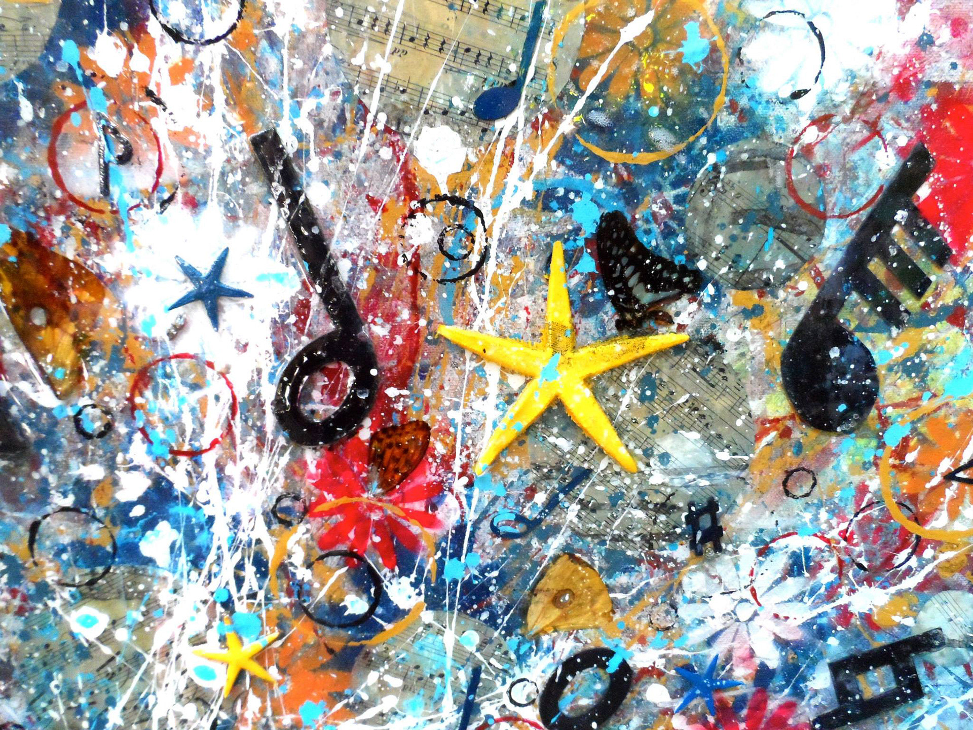 "Natura, Artis Magistra (Nature, the Mistress of Art) - Oceanus Suite: Vol. I" Acrylic, Ink, Paper Mache (vase is 3D), Antique Sheet Music from c.1867 (vase, table, background), Antique Piano Parts from the late 1800s, Real Flowers, Butterflies, Starfish with Glossy Resin Glaze (shines like glass) on Canvas, 48 x 48 x 3" (Sold)