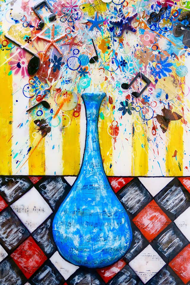 “Natura, Artis Magistra (Nature, the Mistress of Art) Oceanus Suite: Vol. V" Media: Acrylic, Ink, Paper Mache, Antique Sheet Music from c.1870s (vase, table & background), Antique Piano Parts from the late 1800s, Butterflies, Starfish, Sand Dollars with Glossy Resin Glaze (shines like glass) on Canvas, 24 x 48 x 3” (Sold - Private Collection, Los Angeles, CA)