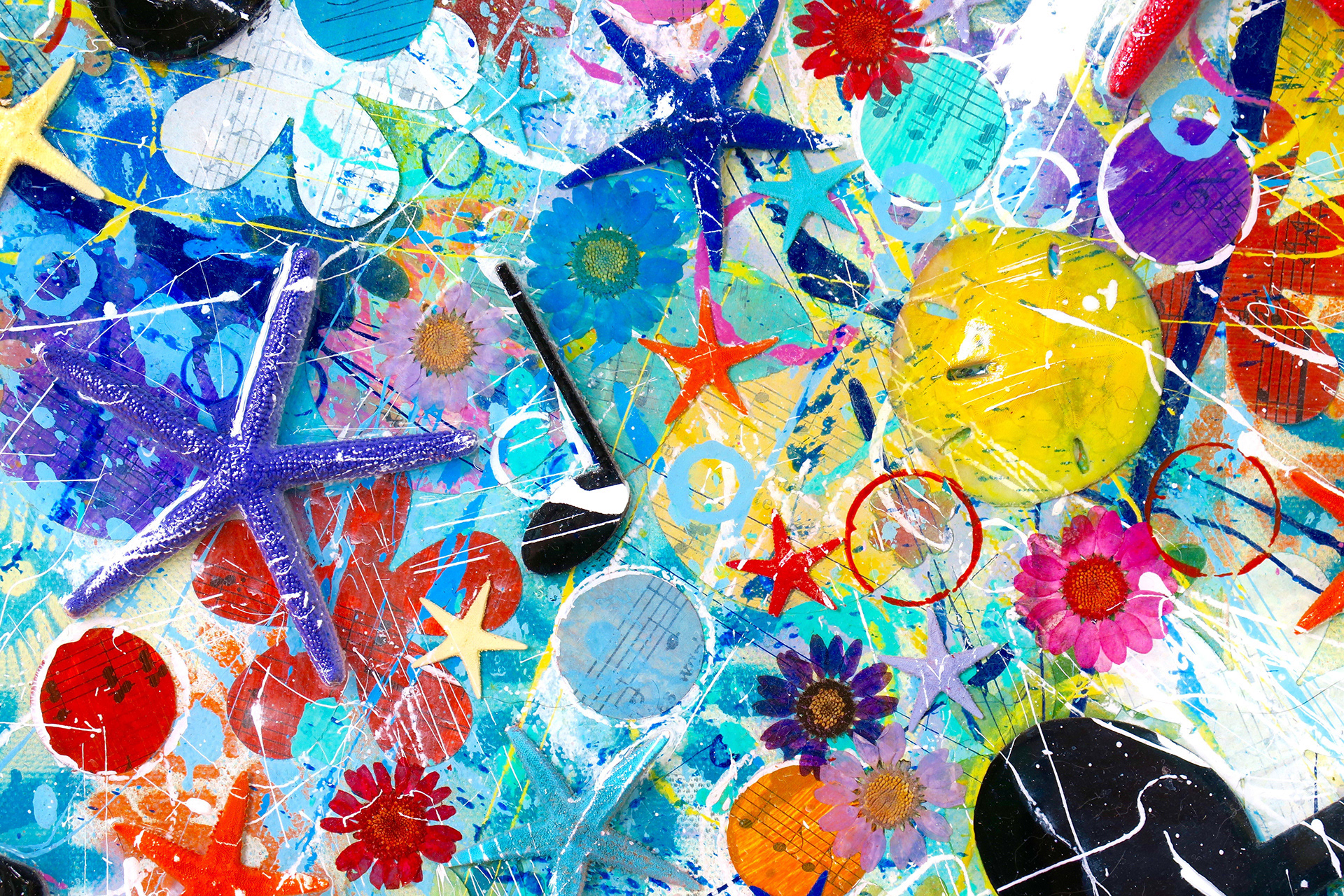 “Natura, Artis Magistra (Nature, the Mistress of Art) Oceanus Suite: Vol. VI" Acrylic, Ink, Paper Mache (vase pops off canvas 1.5"), Antique Sheet Music from c.1880s (vase, table & background), Wood, Butterflies, Starfish, Sand Dollars with Glossy Resin Glaze (shines like glass) on Canvas, 24 x 36 x 3”