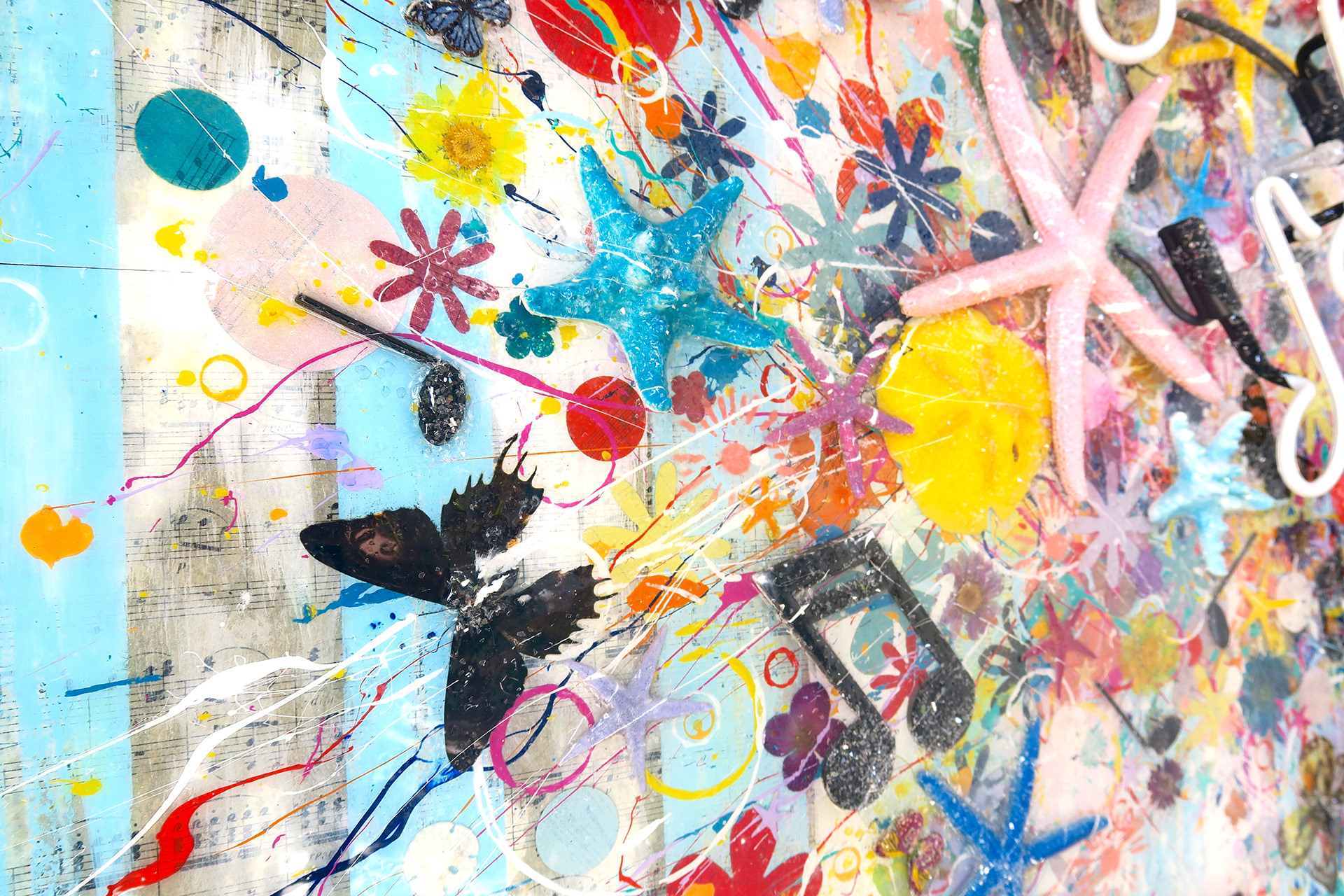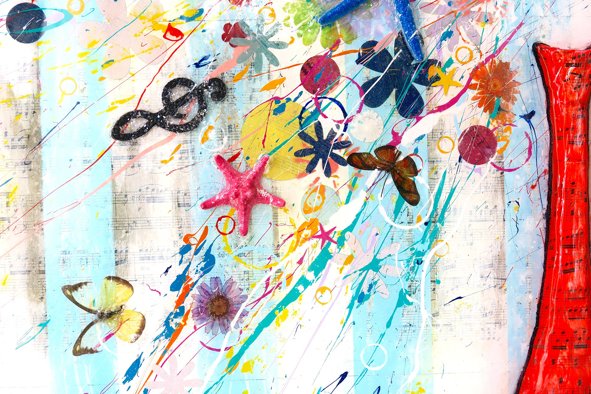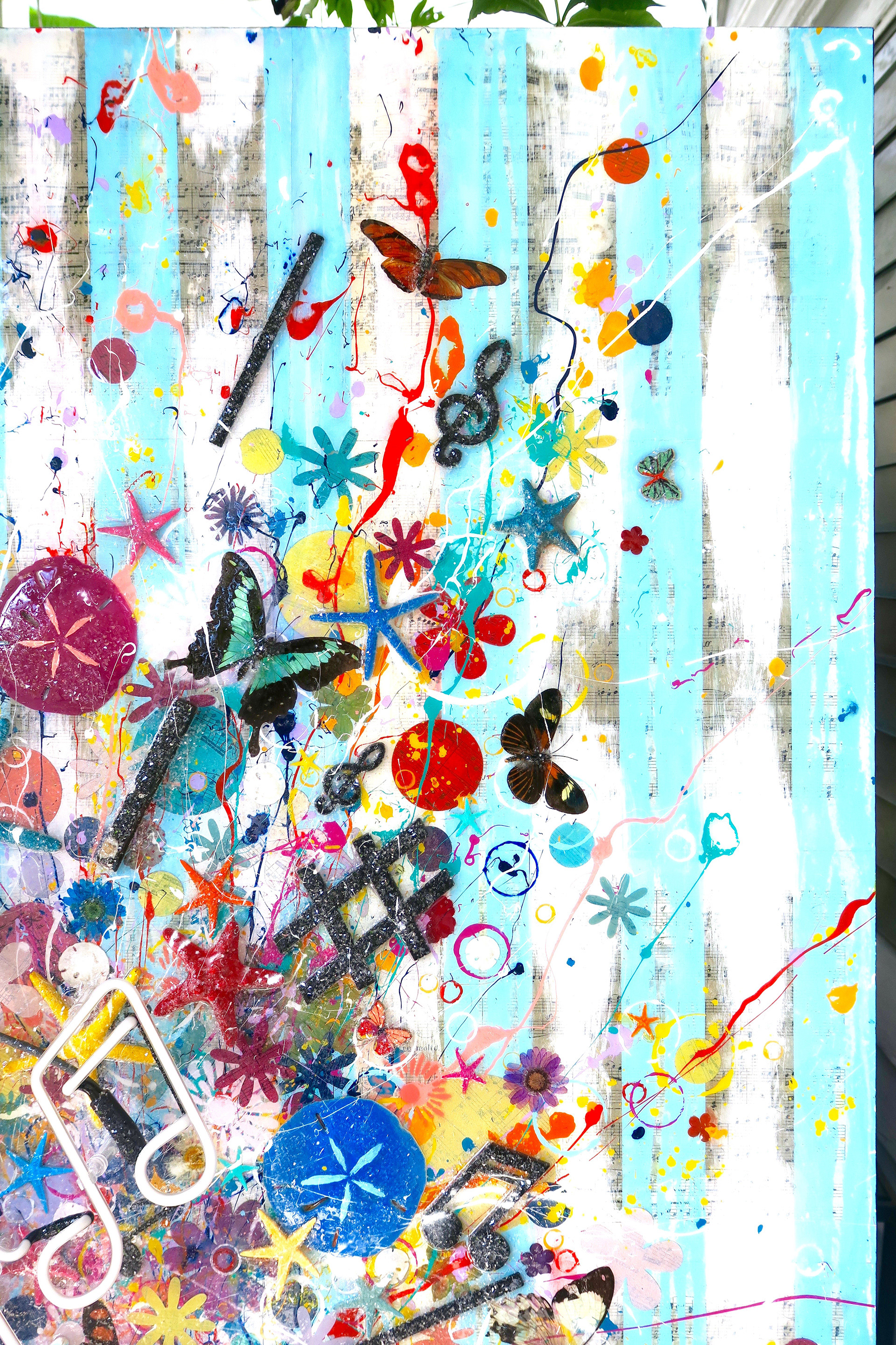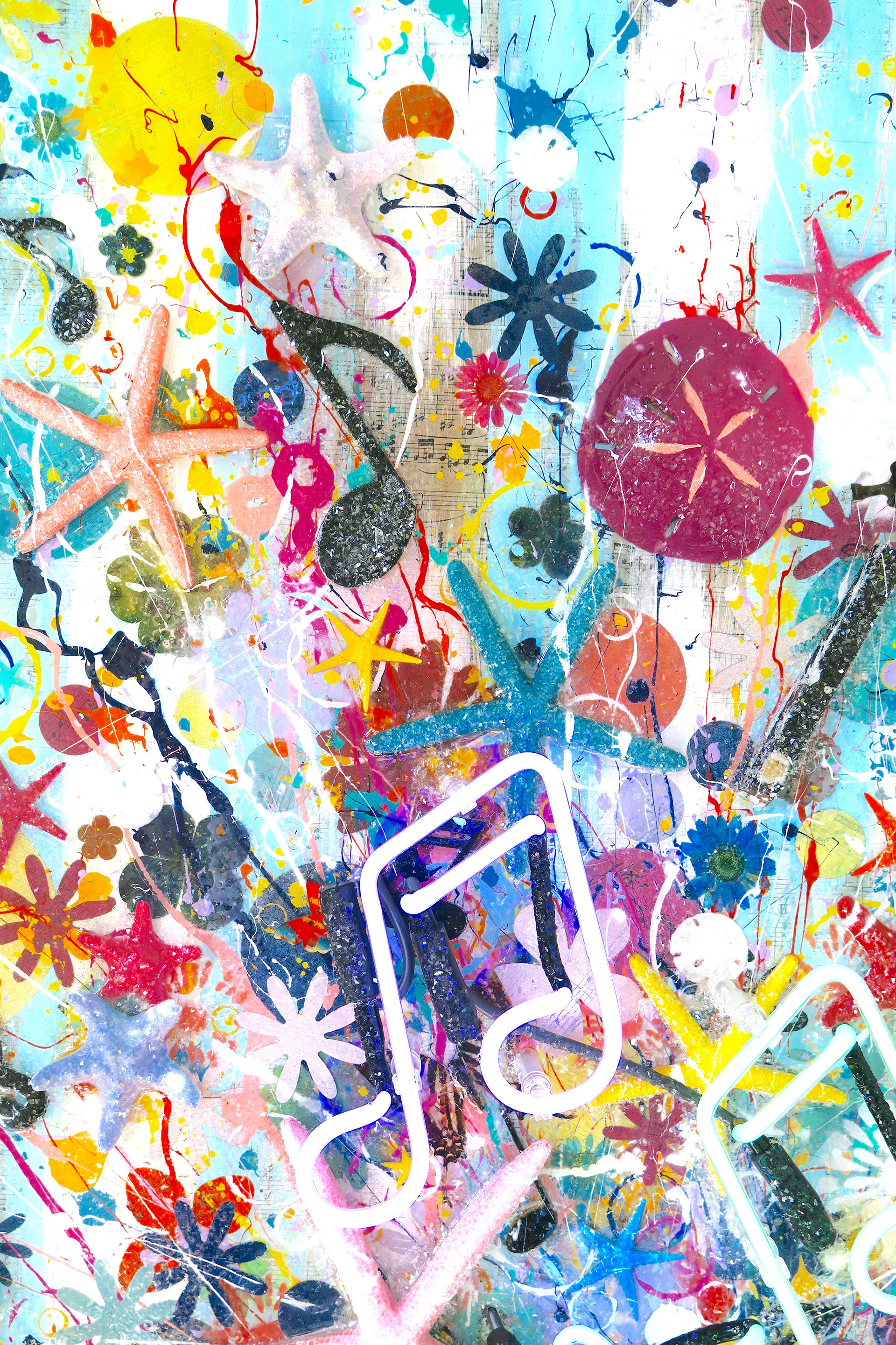 "Natura, Artis Magistra (Nature, the Mistress of Art) Oceanus Suite: Vol. XII" Acrylic, Ink, Neon Light (musical notes glow), Paper Mache (vase pops off canvas 2"), Antique Sheet Music from c.1893 of Beethoven's Symphony II (vase, table & background), Wood, Butterflies, Starfish, Sand Dollars, Diamond Dust (twinkle effect) with Glossy Resin Glaze (shines like glass) on Aluminum, 37 x 65 x 5”