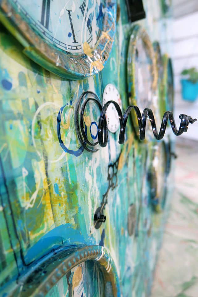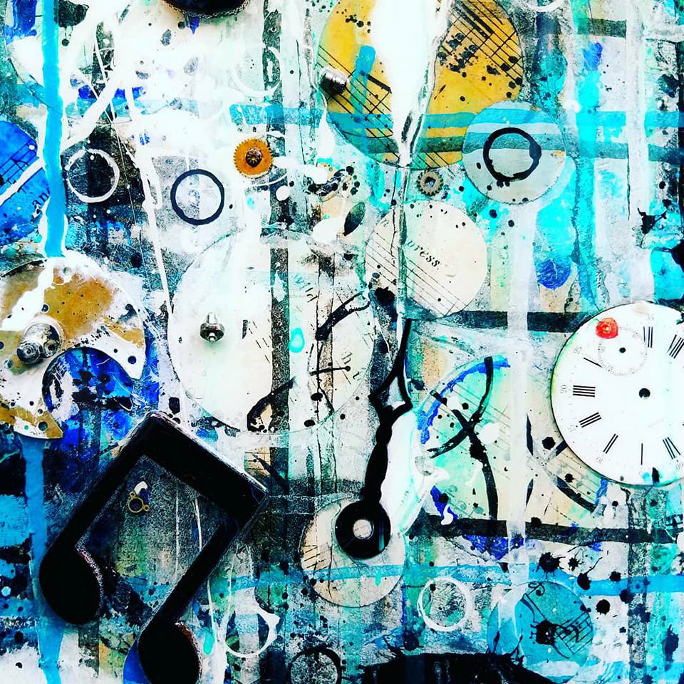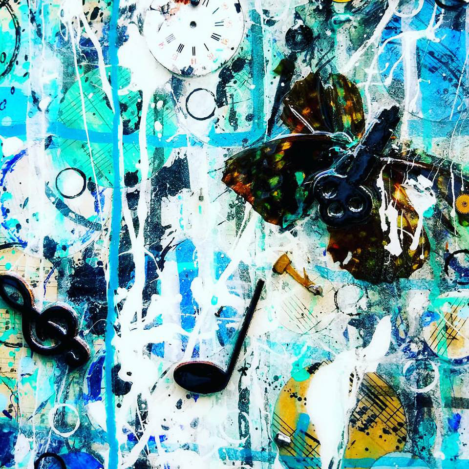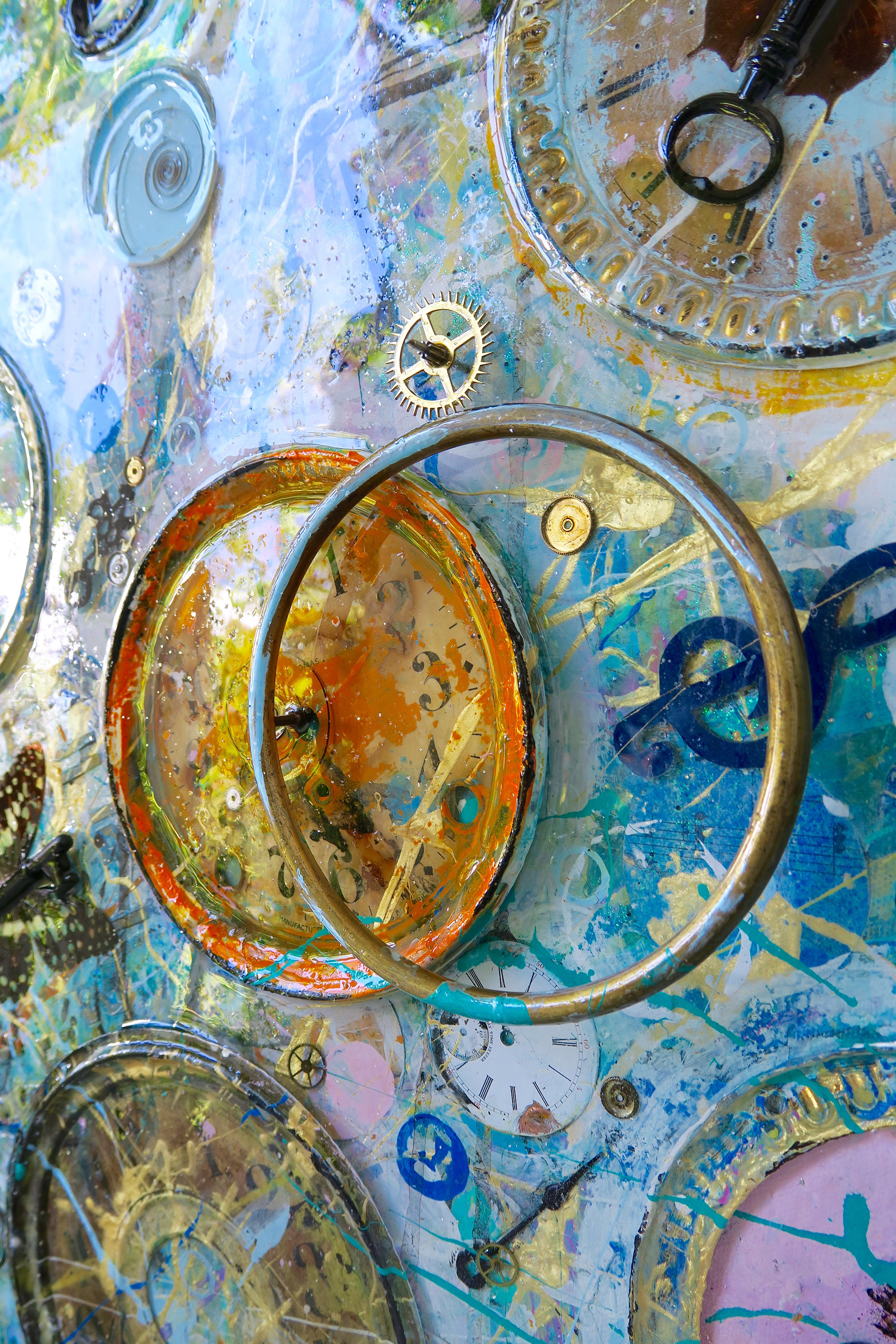 Acrylic, Ink, Pastel, Antique Door Knob Face from c.1840’s, Antique Sheet Music from c. 1878, Real Butterflies, Antique Clock Parts/Hands from the late 1800s & Early 20th Century, Antique Skeleton Keys from the late 1800s, w/ Glossy Resin Glaze (shines like glass) on Canvas, 60 x 48 x 4" (Sold)