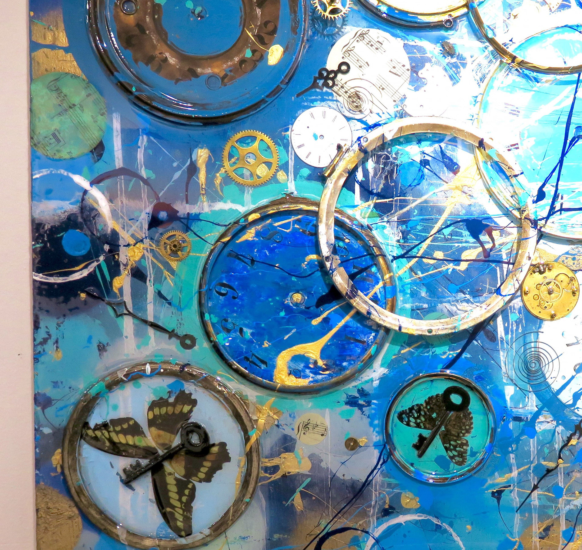 Acrylic, Ink, Antique Clocks & Porcelain Pocket Watch Parts c.1880s - early 1900s, Antique Sheet Music c. 1880s, Antique Skeleton Keys c.1800s, Butterflies with Glossy Resin Glaze (shines like glass) on Aluminum, 24 x 36 x 4”