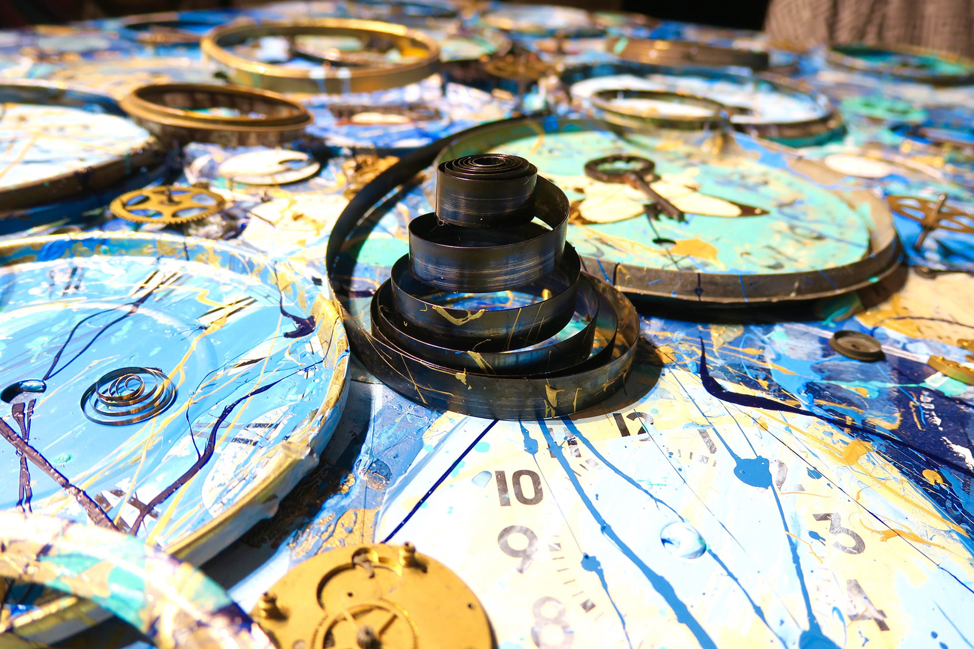 “Tempus Fugit (Time Flies) Suite: Vol. VIII” Acrylic, Ink, Pastel, Antique Sheet Music from c. 1878, Real Butterflies, Antique Porcelain Pocket Watch Faces, Springs, Gears/Parts & Hands from the late 1800s & Early 20th Century, Antique Skeleton Keys from the late 1800s, w/ Glossy Glaze on Aluminum (shines like glass), 70 x 33 x 2"