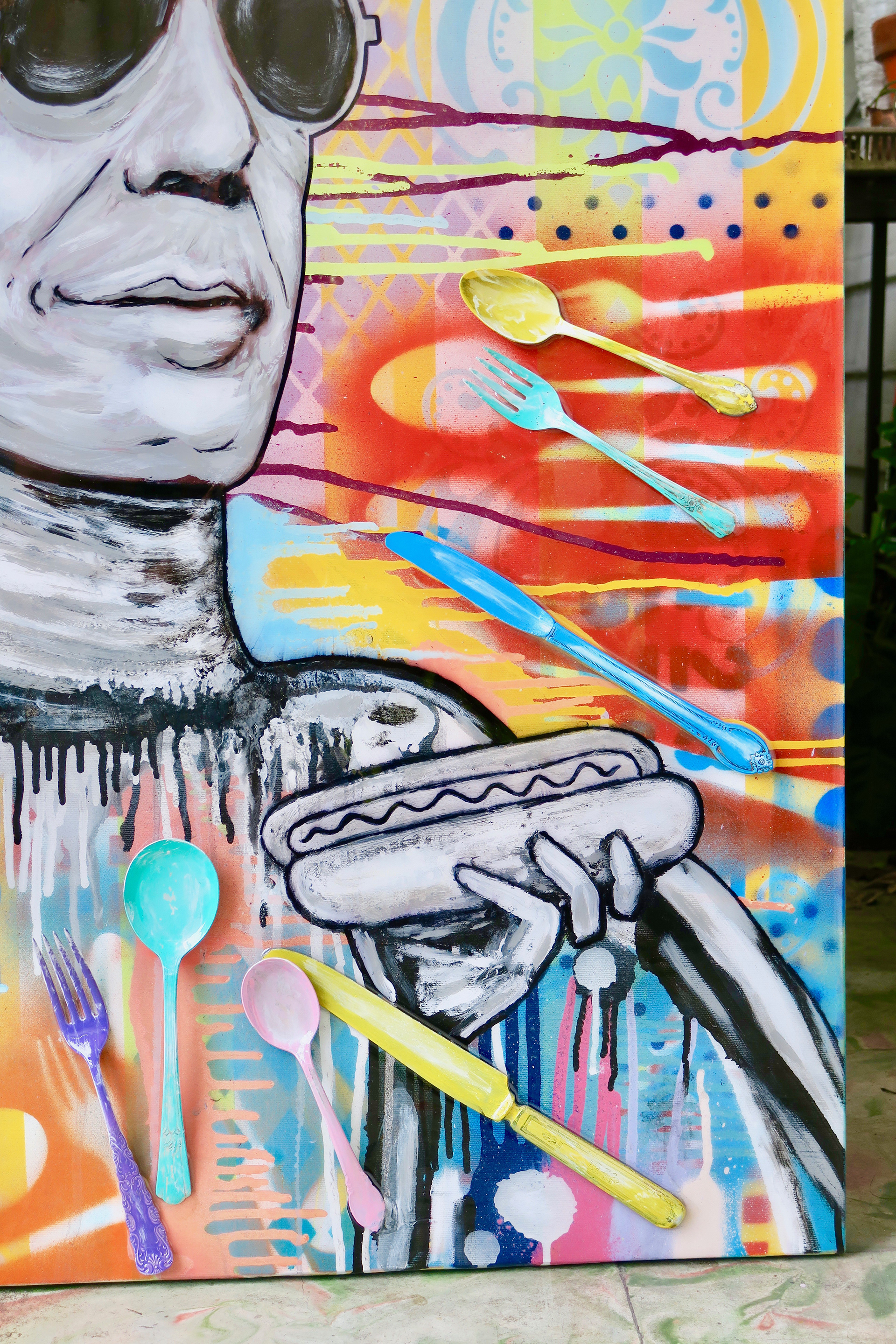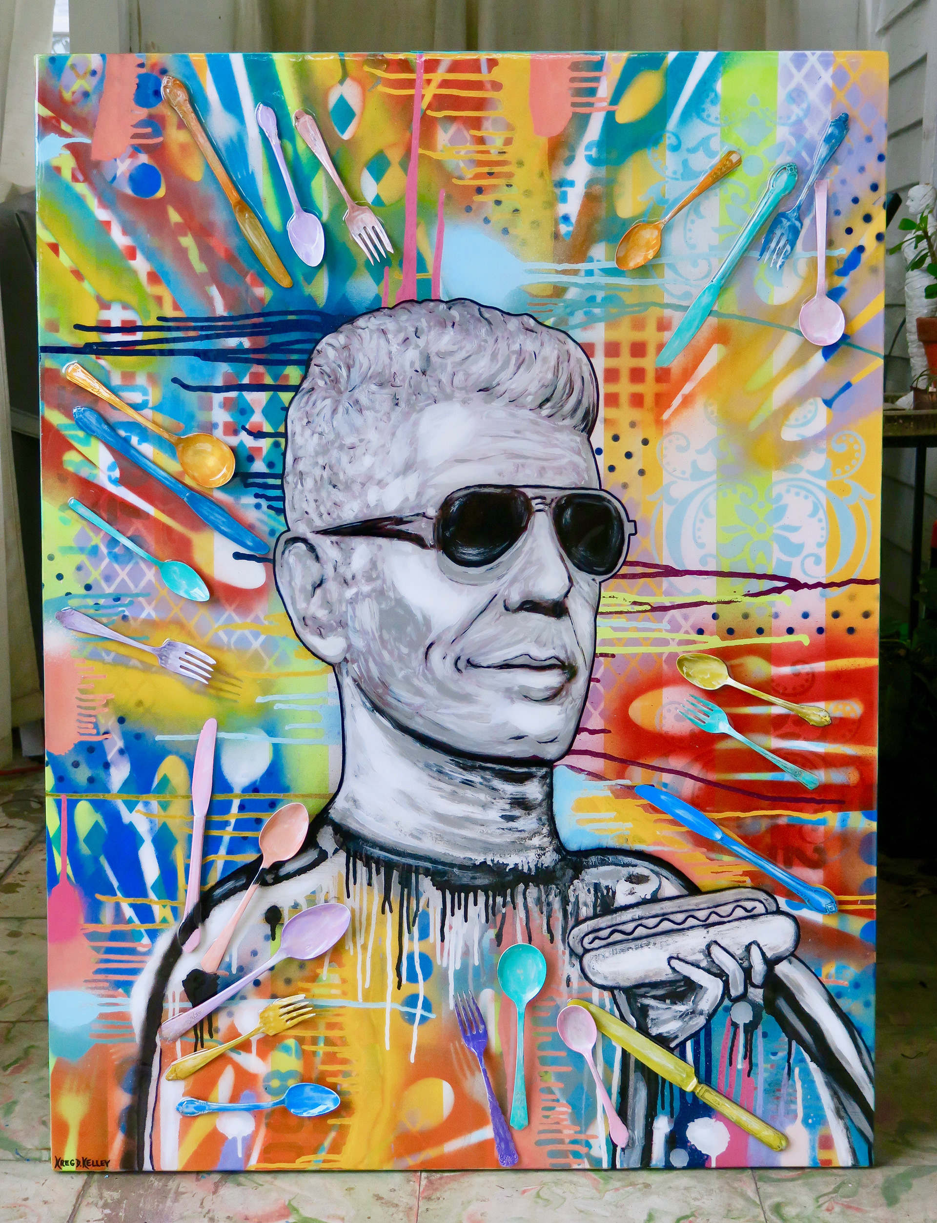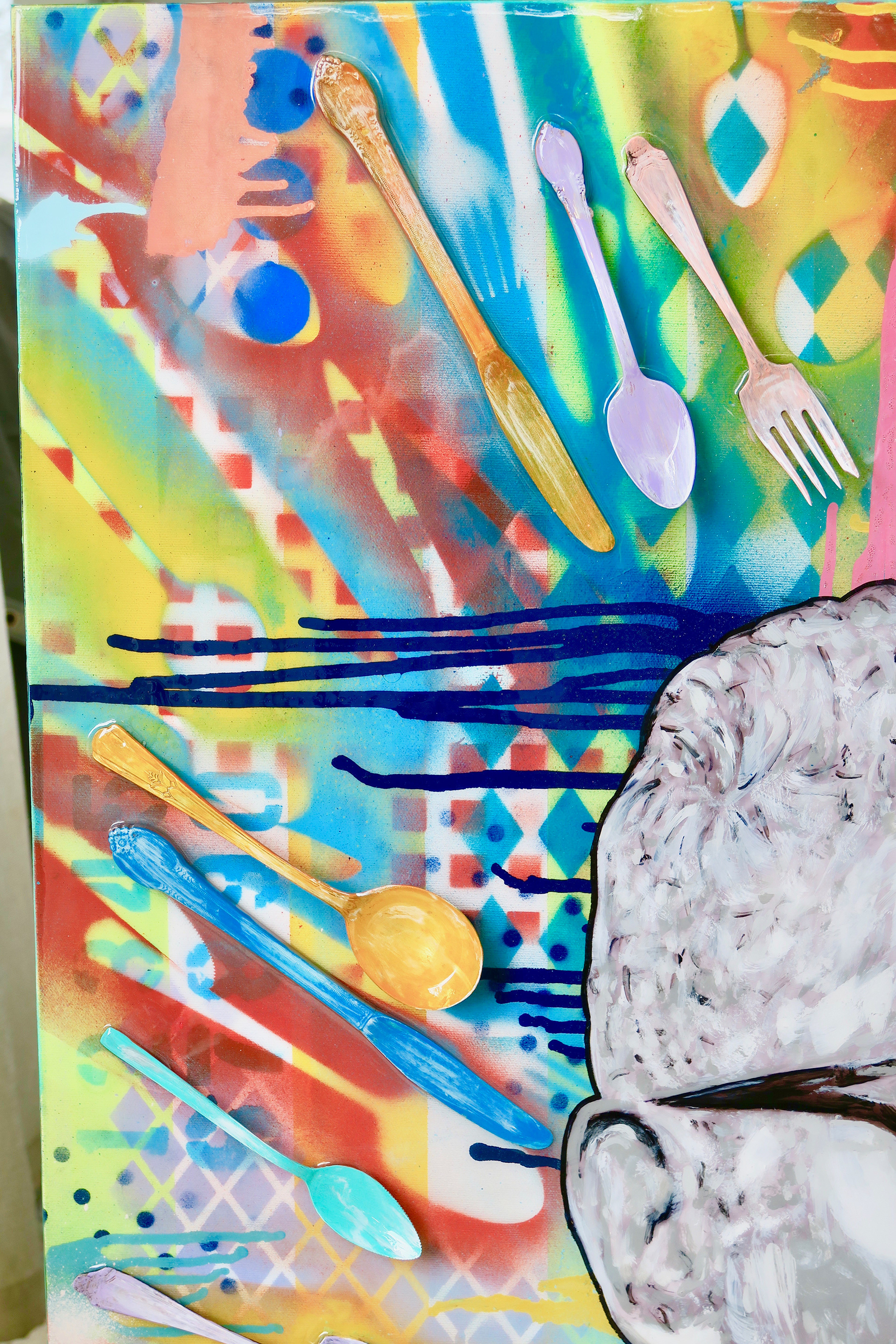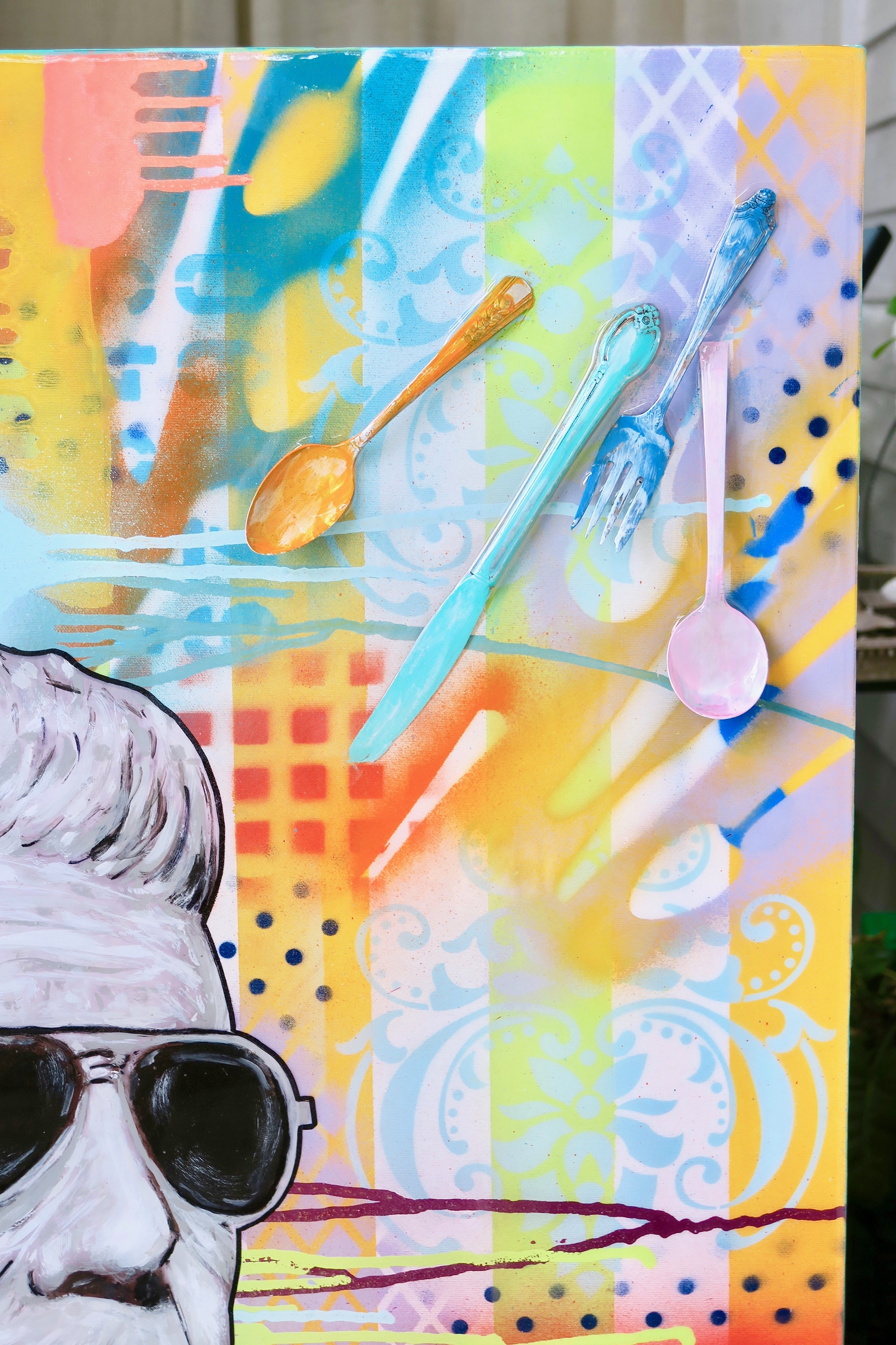 "Eat Well: Homage To Bourdain" Acrylic, Ink, Antique Silverware, Antique Sheet Music c.1893 (sides), with Glossy Resin Glaze (shines like glass) on Canvas, 30 x 40 x 3”