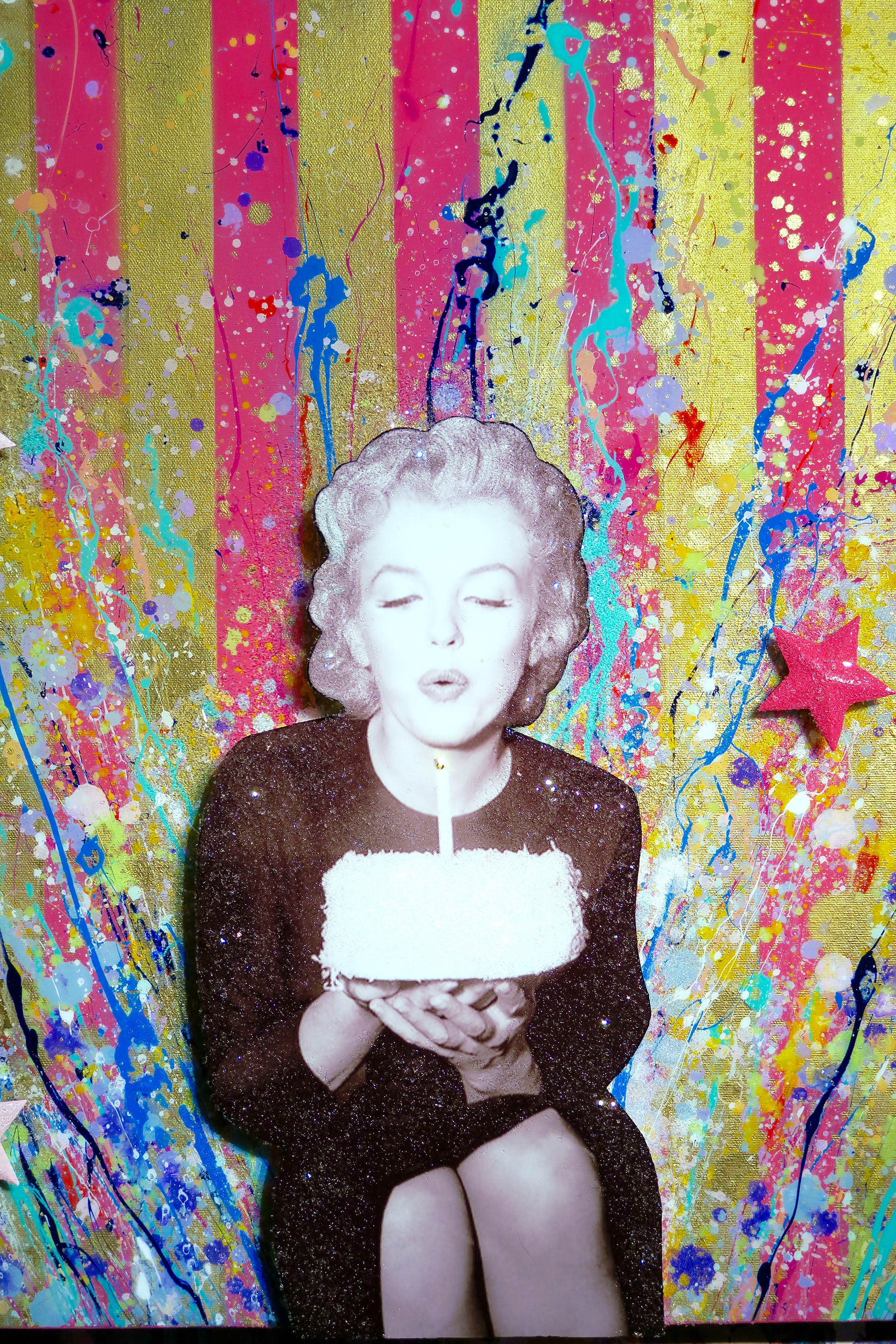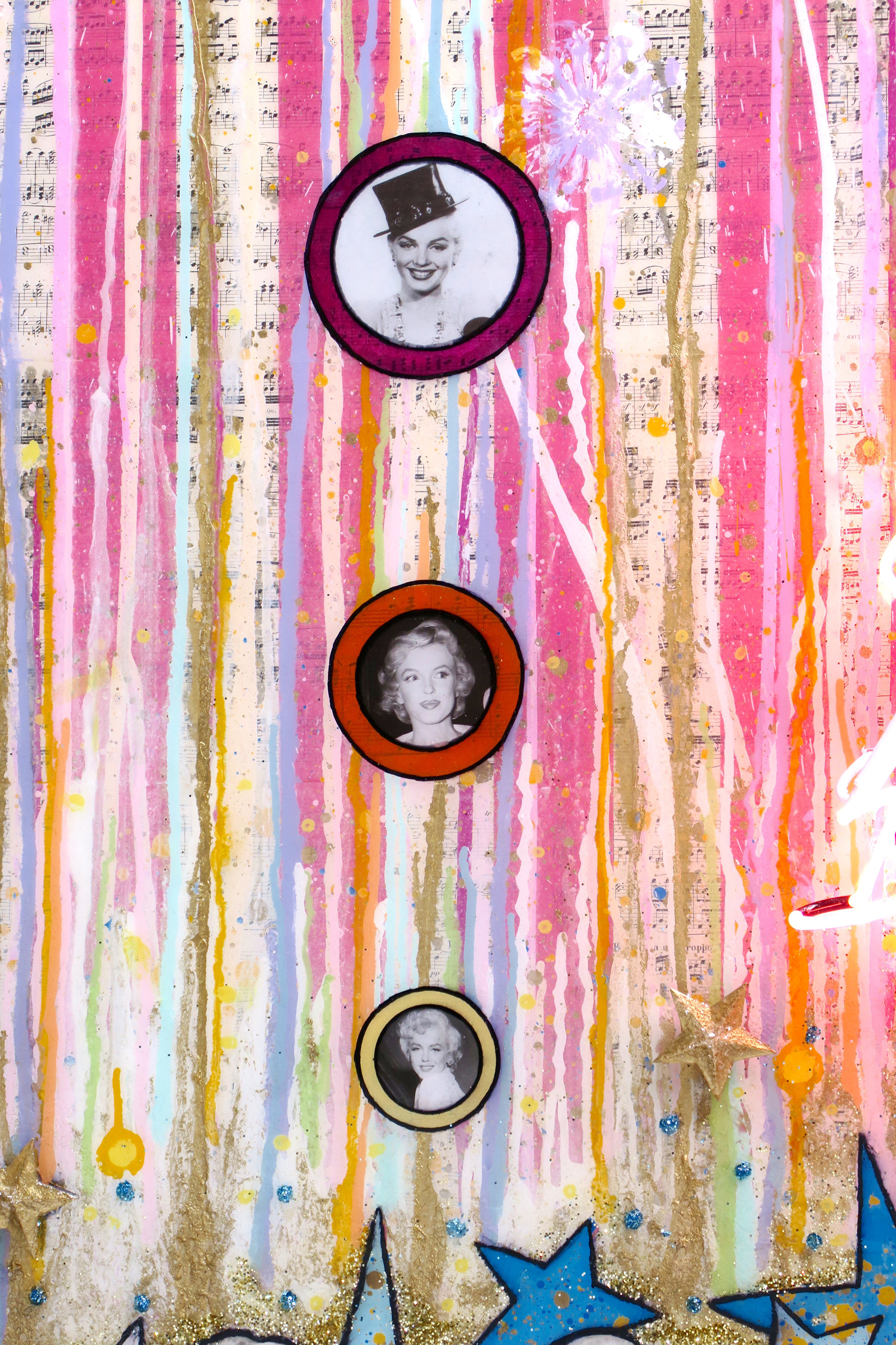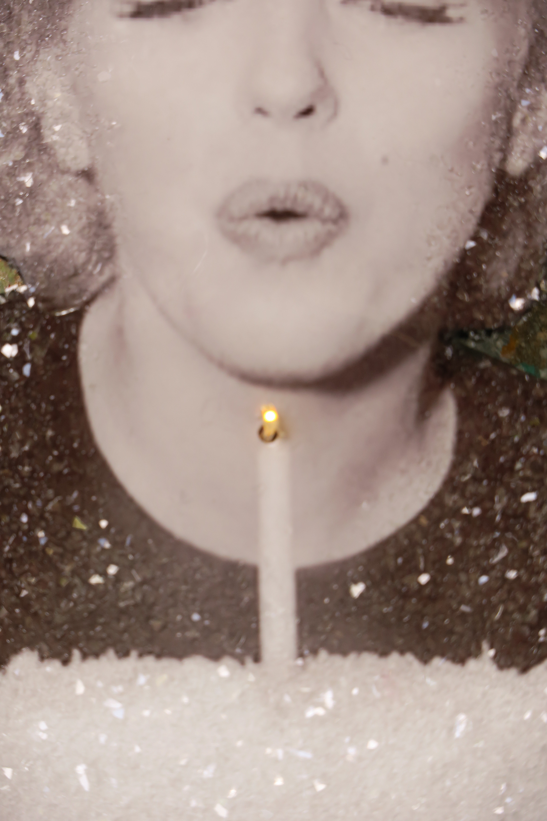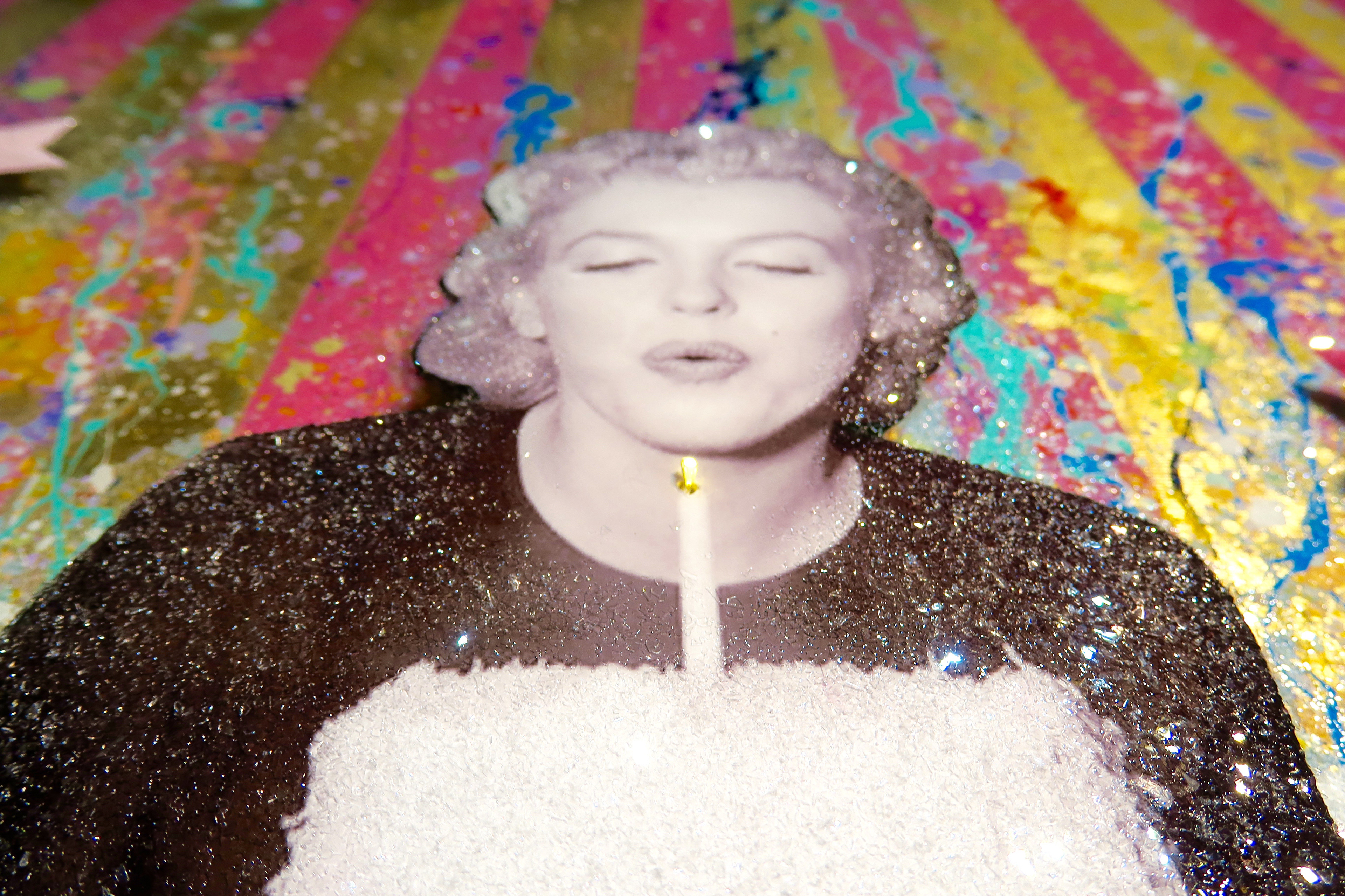 "Happy Birthday, Marilyn" Acrylic, Ink, LED Light (candle & behind Marilyn lights up), Photograph from June 1st, 1956 on her 30th (floating 2"), Metal Stars (floating 2"), Diamond Dust (twinkle effect) with Glossy Resin Glaze (shines like glass) on Canvas, 24 x 28 x 2”