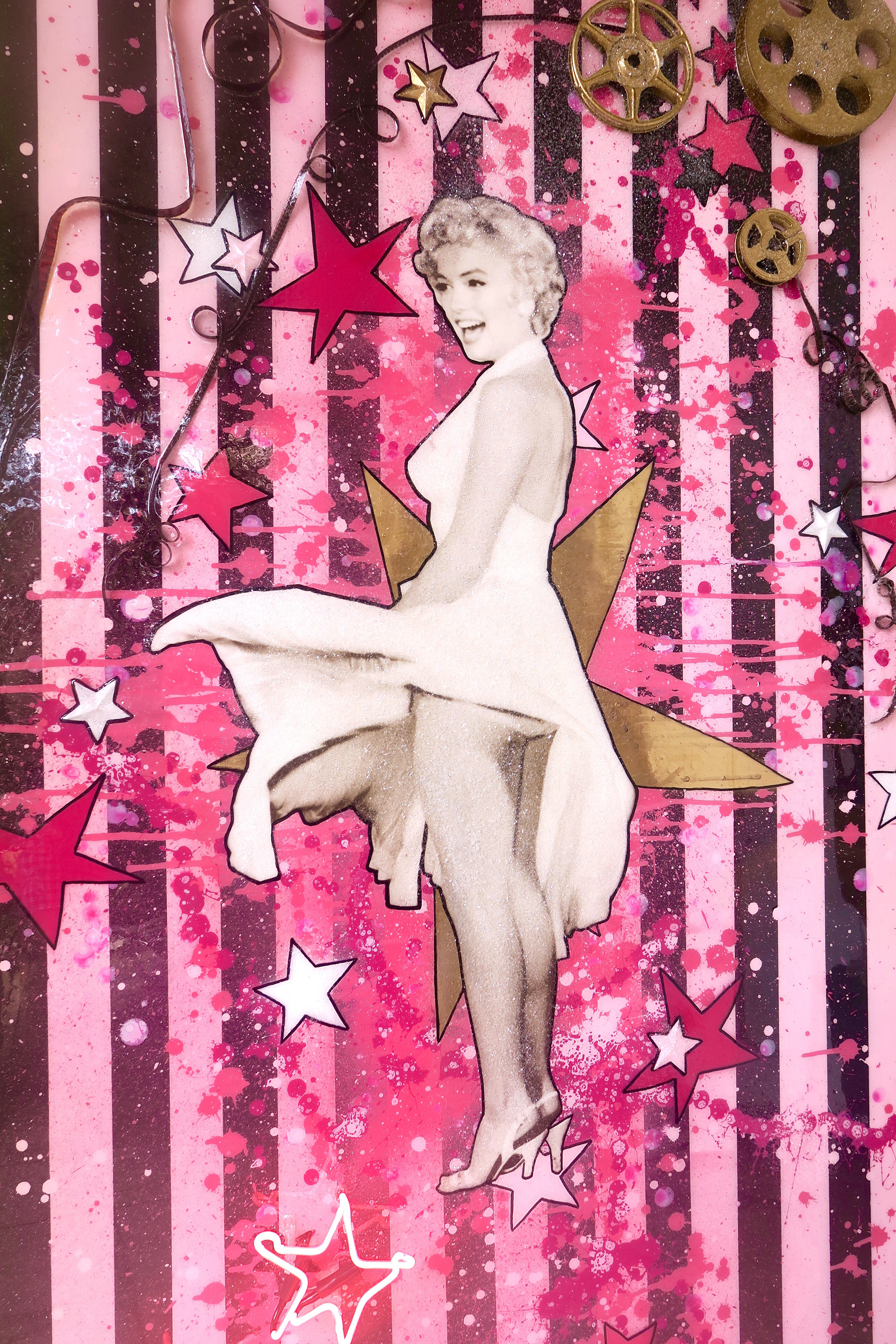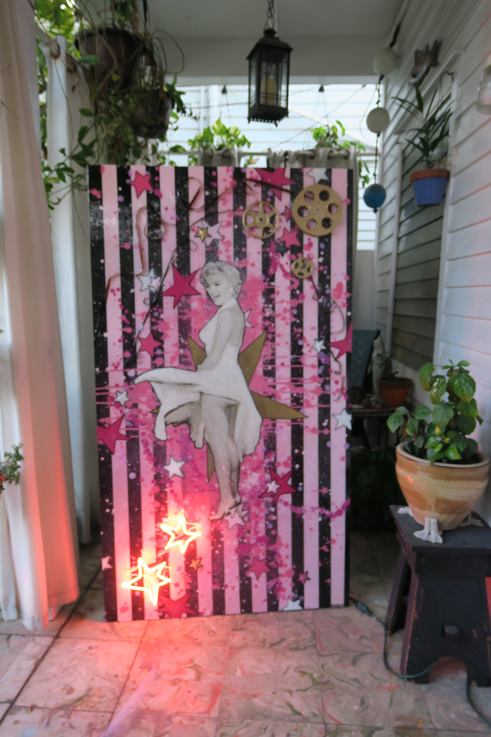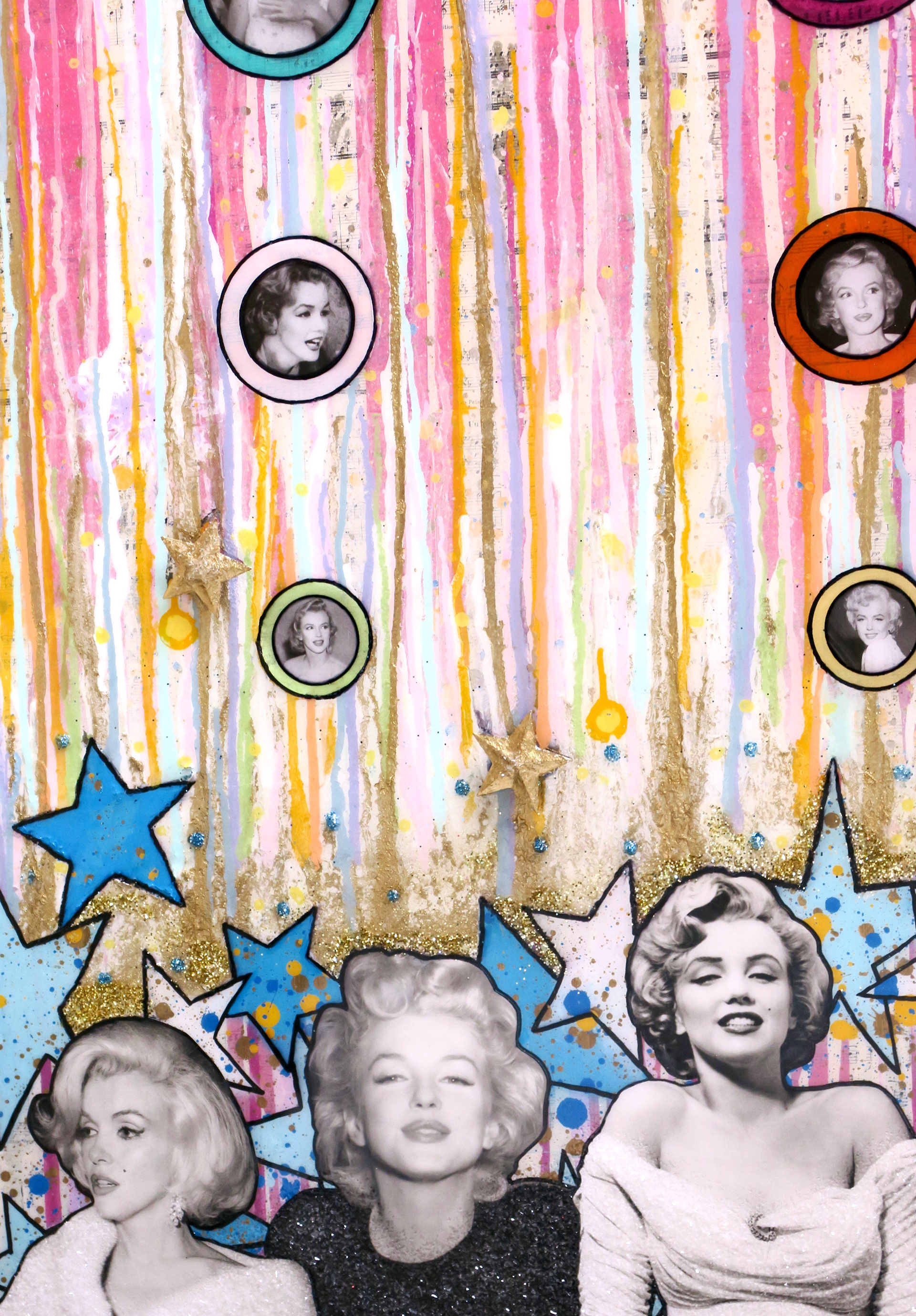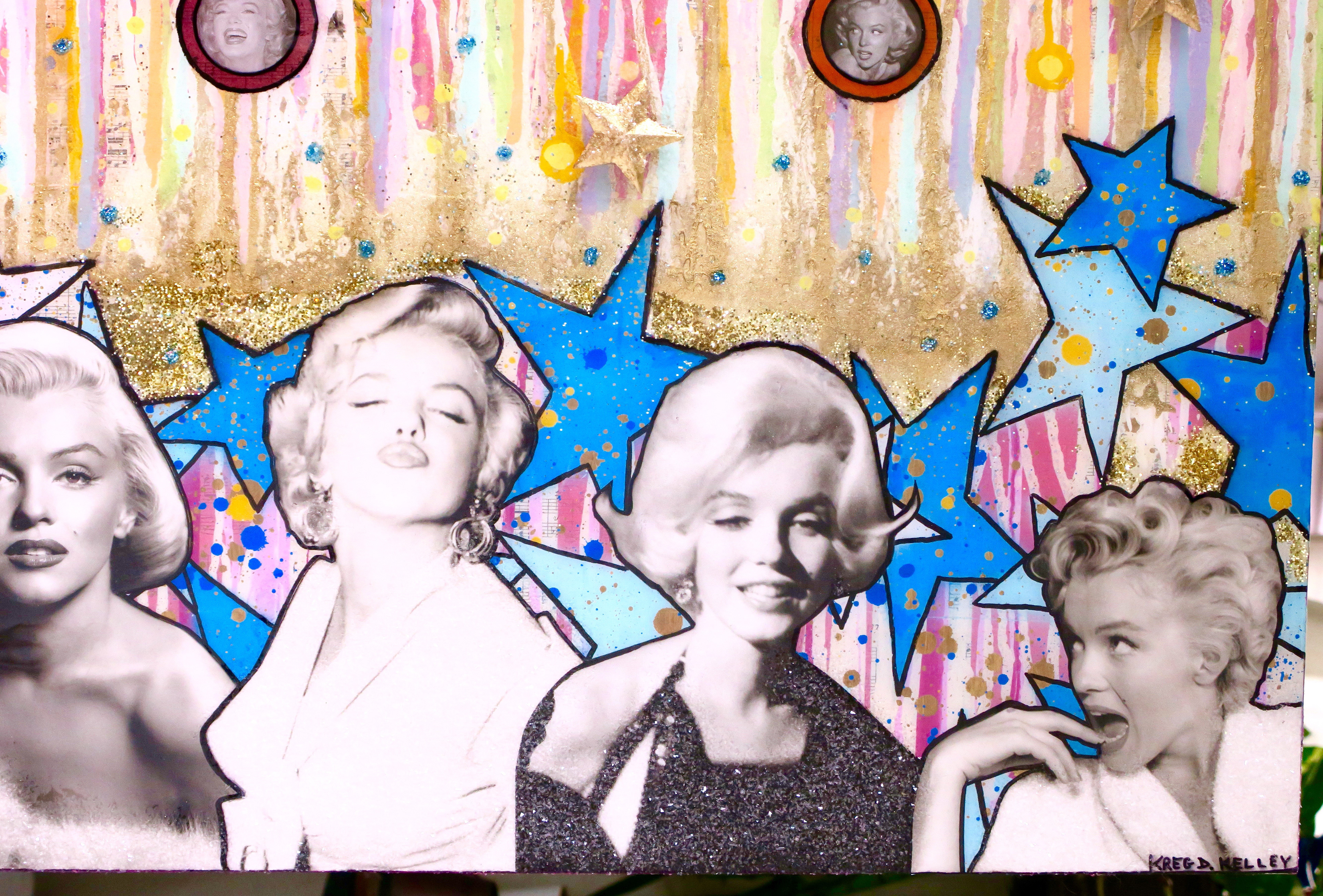 "Happy Birthday, Marilyn" Acrylic, Ink, LED Light (candle & behind Marilyn lights up), Photograph from June 1st, 1956 on her 30th (floating 2"), Metal Stars (floating 2"), Diamond Dust (twinkle effect) with Glossy Resin Glaze (shines like glass) on Canvas, 24 x 28 x 2”