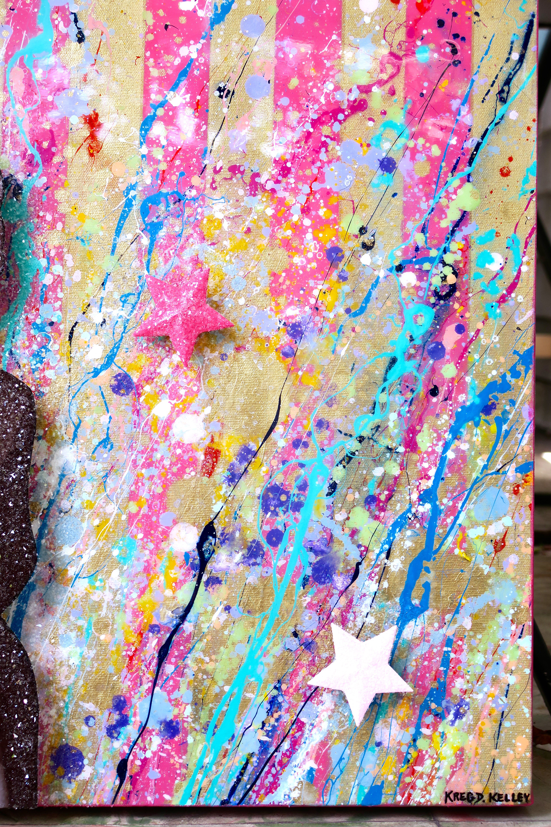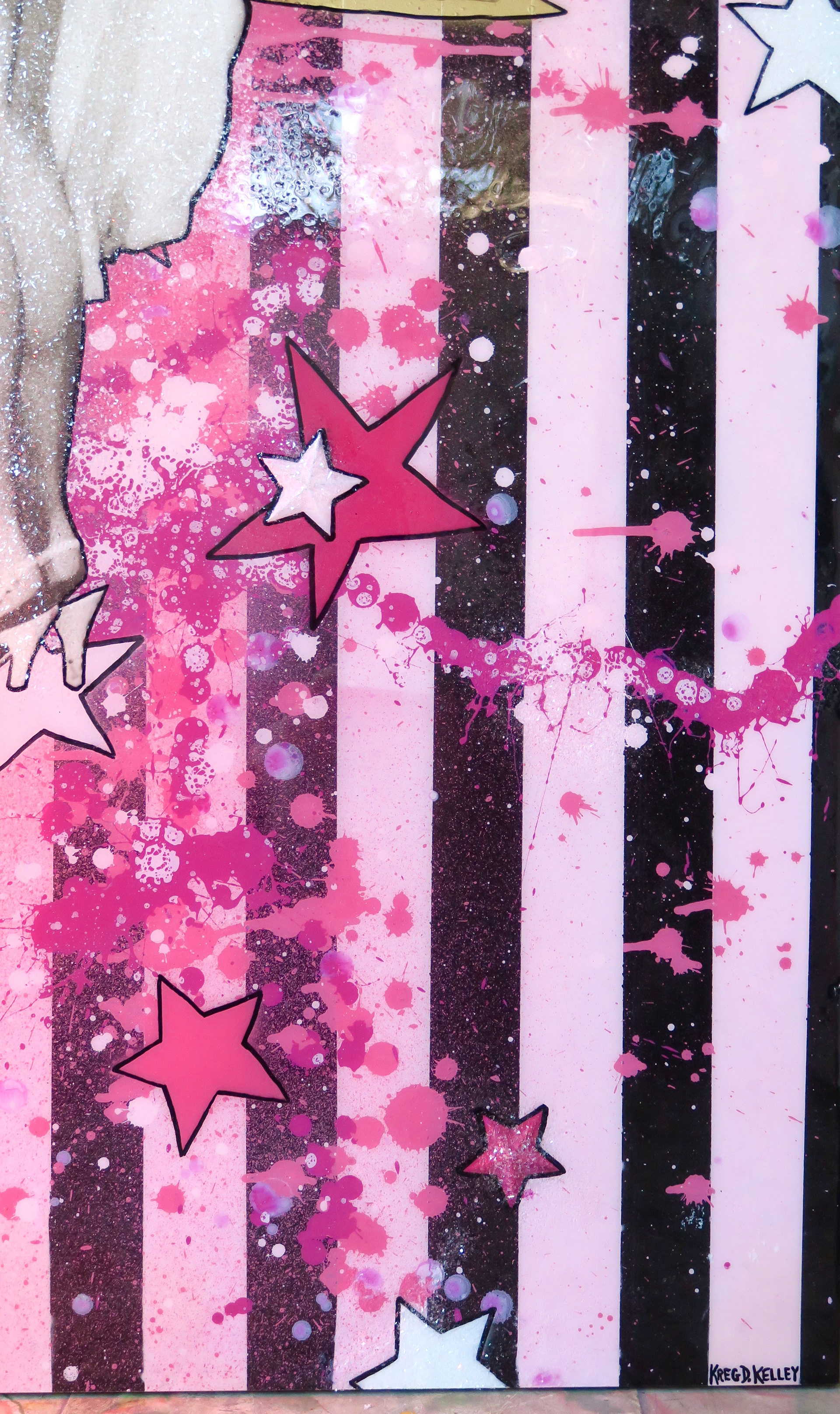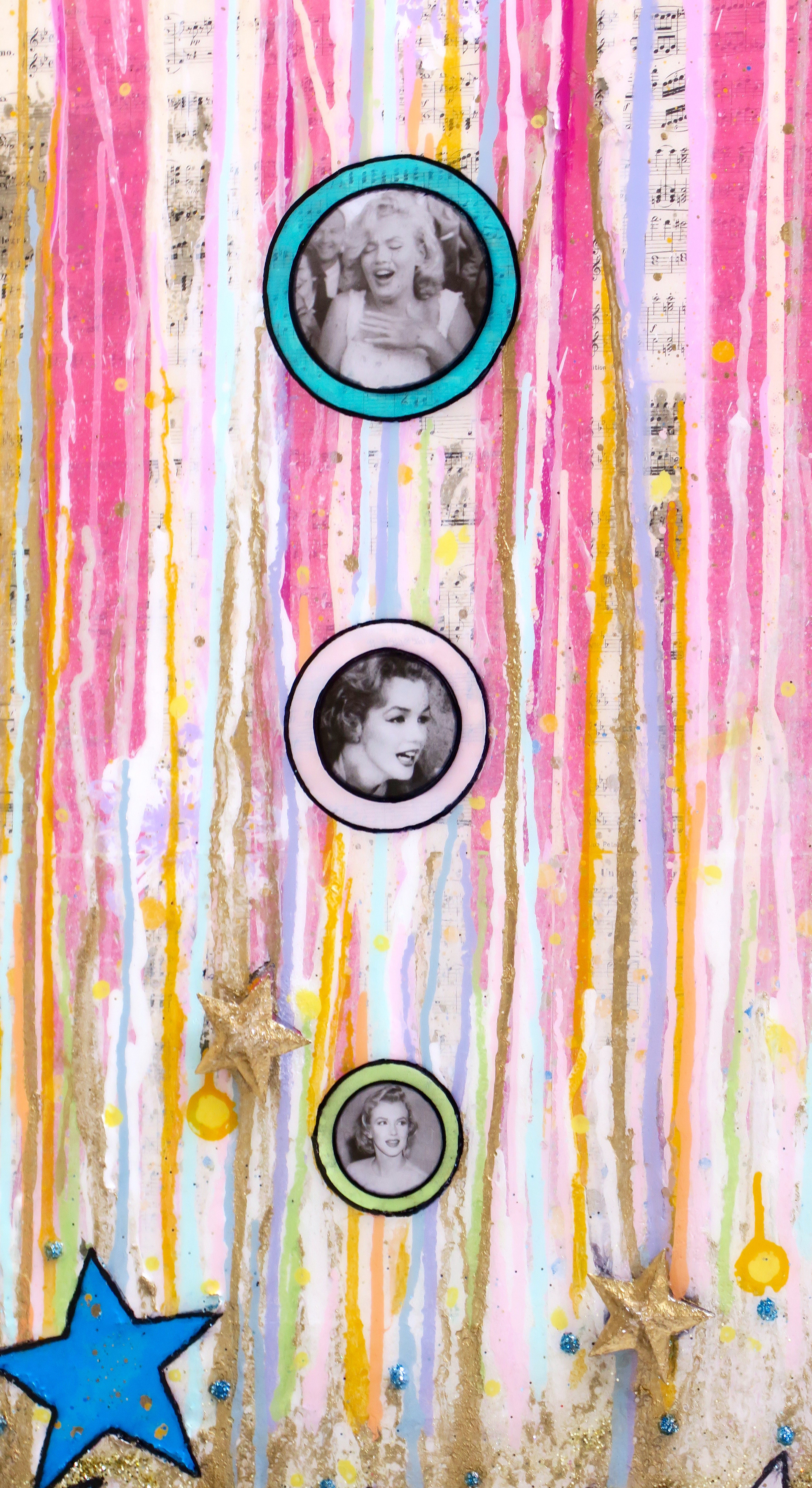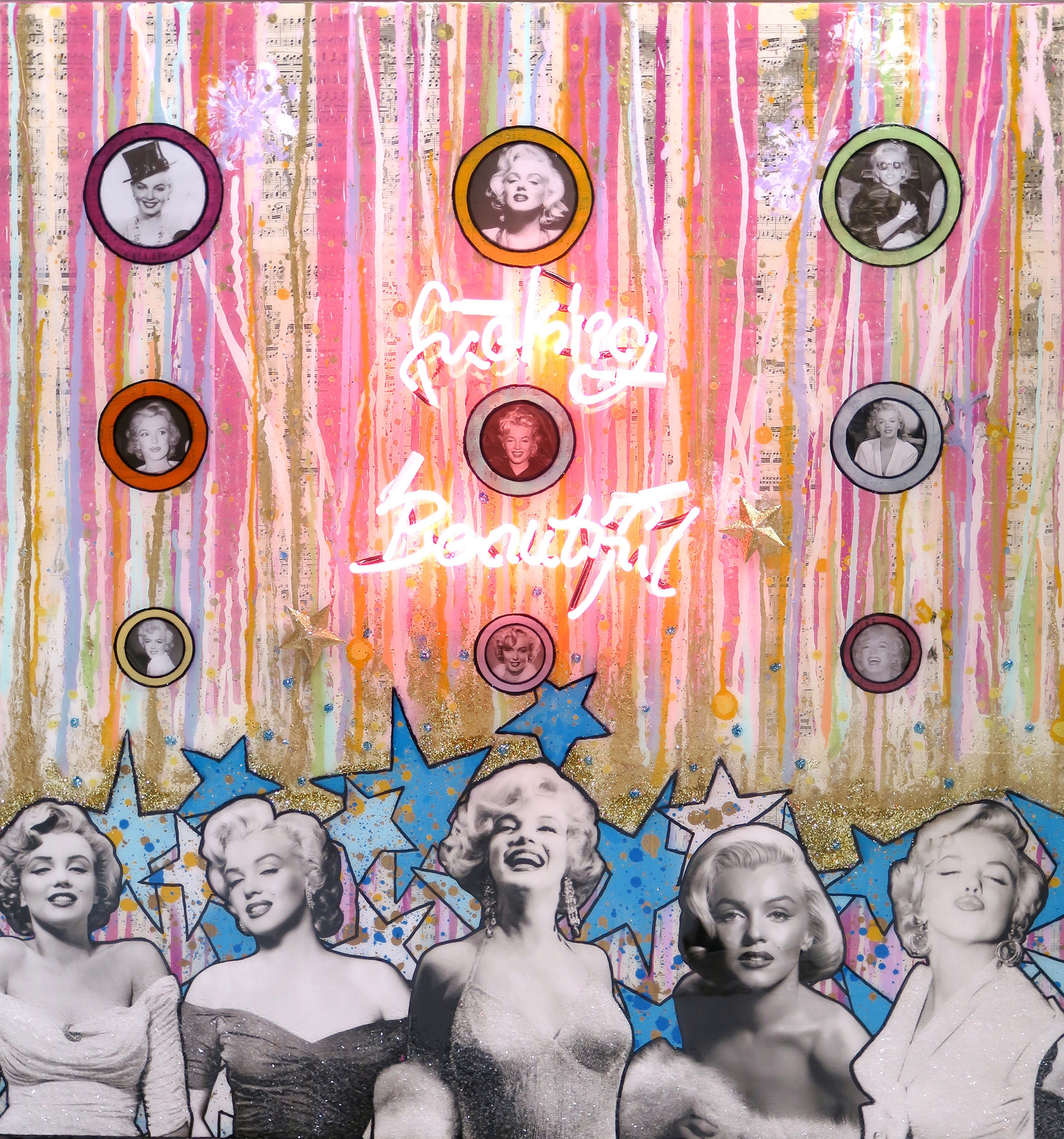 "Happy Birthday, Marilyn" Acrylic, Ink, LED Light (candle & behind Marilyn lights up), Photograph from June 1st, 1956 on her 30th (floating 2"), Metal Stars (floating 2"), Diamond Dust (twinkle effect) with Glossy Resin Glaze (shines like glass) on Canvas, 24 x 28 x 2”