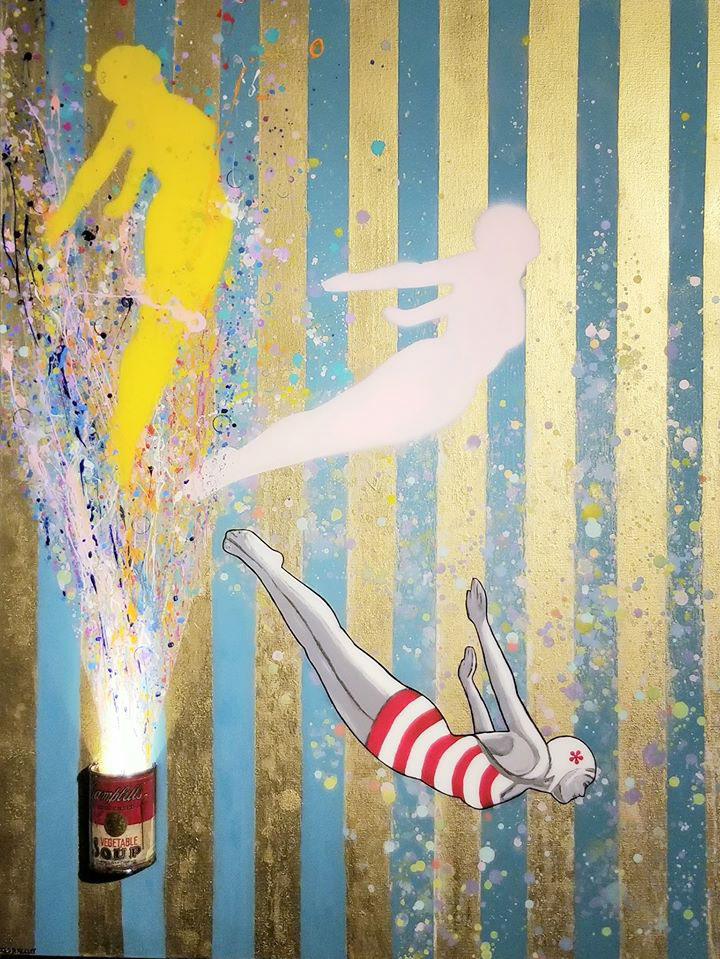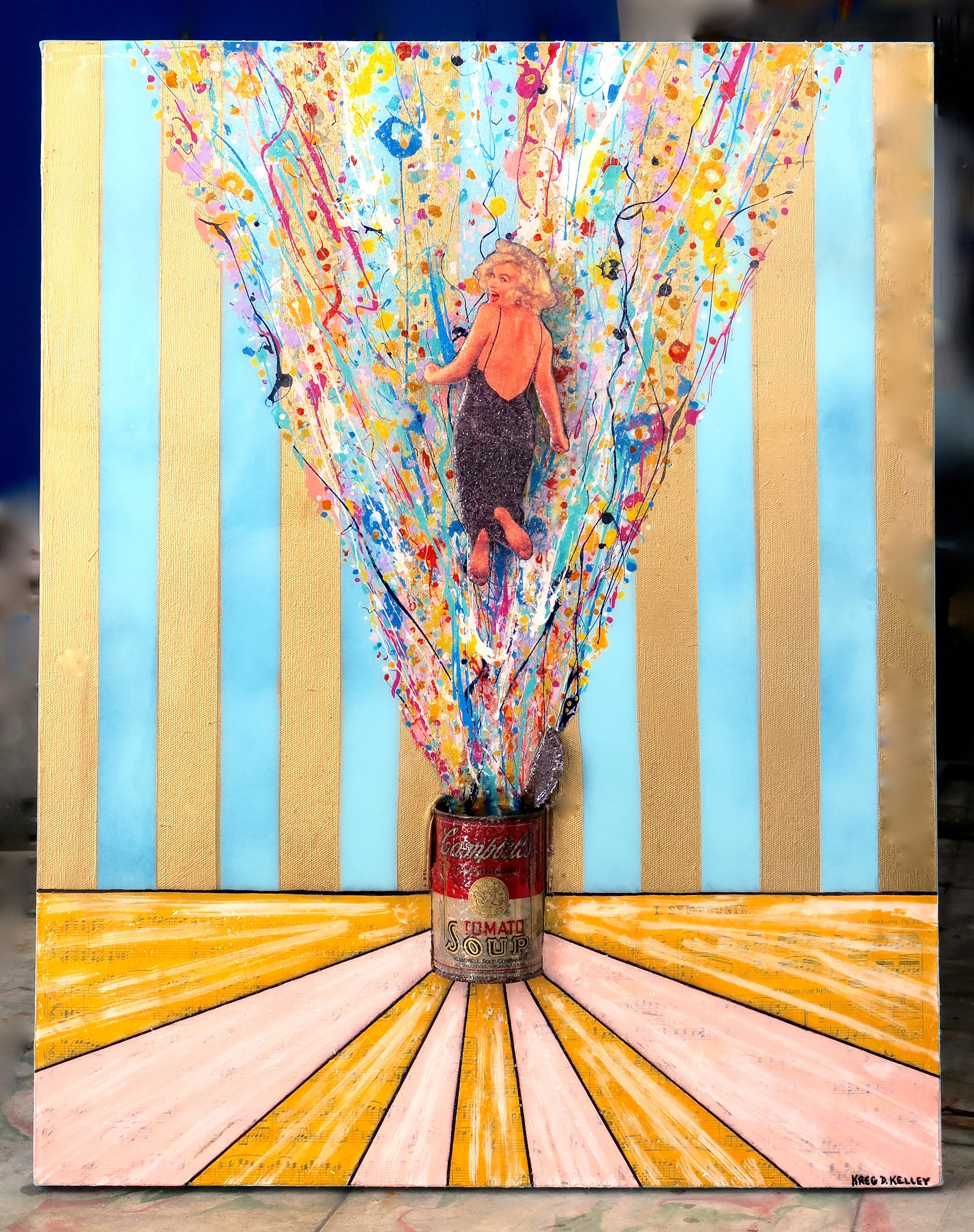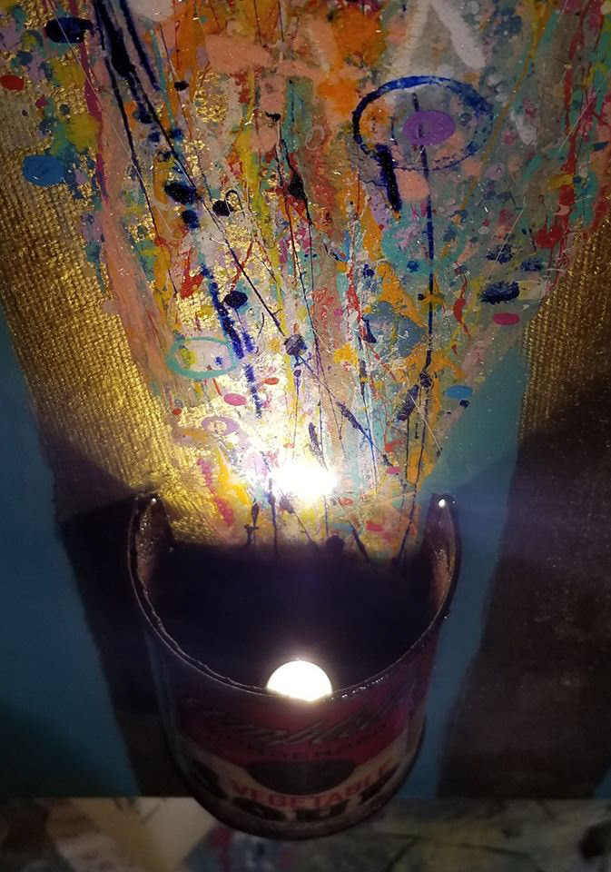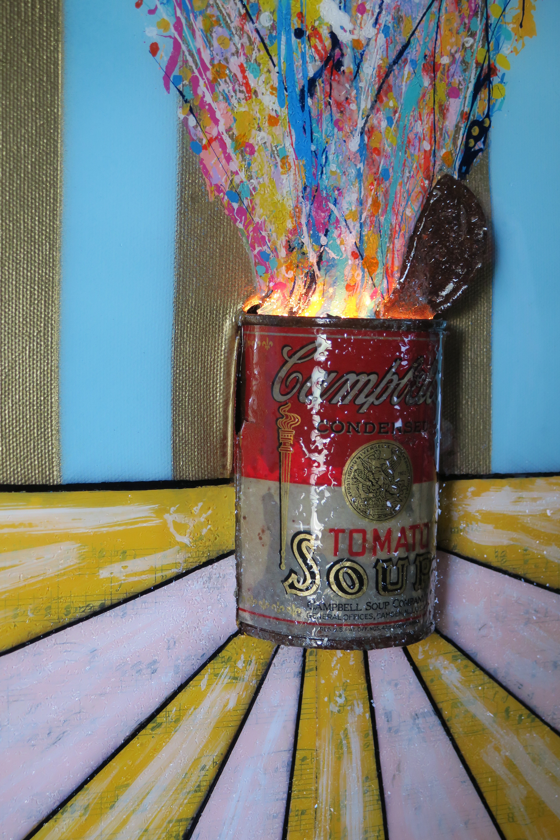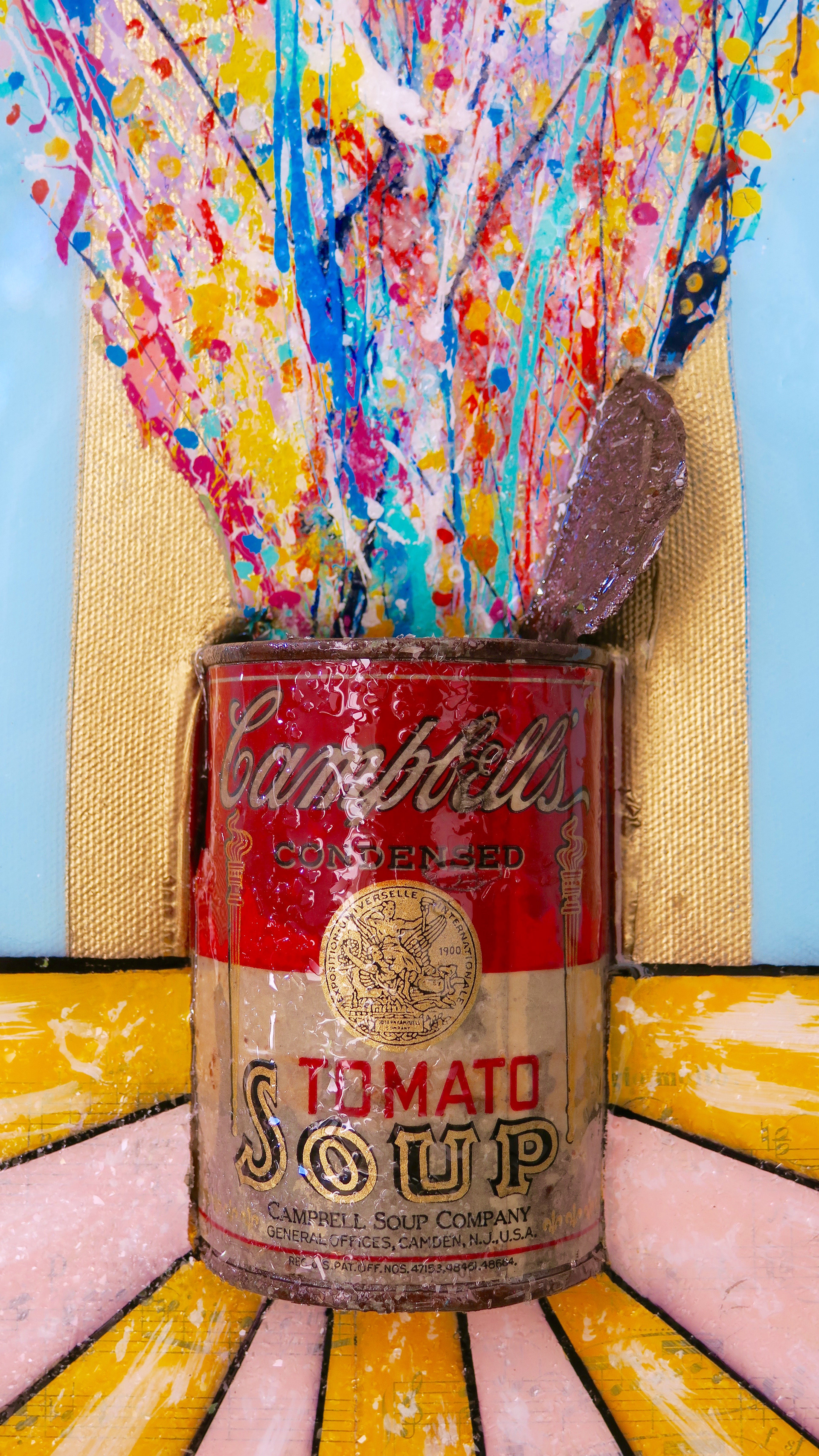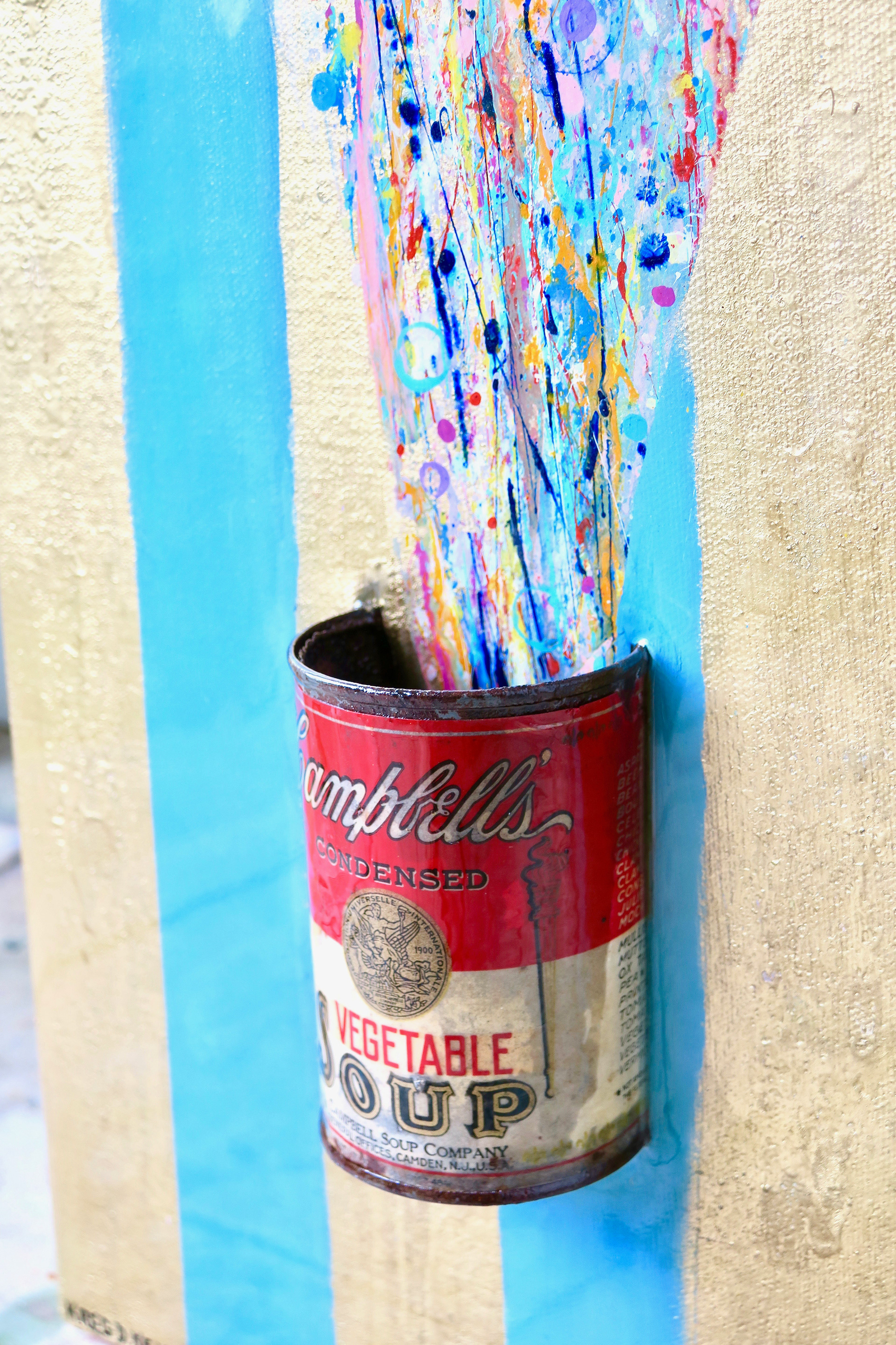 "Free Spirit" Acrylic, Ink, Original Antique Campbell's Vegetable Soup Can from c.1922, LED Dimmable Spotlight (in can), Glossy Resin Glaze (shines like glass) on Canvas, 30 x 40 x 3”