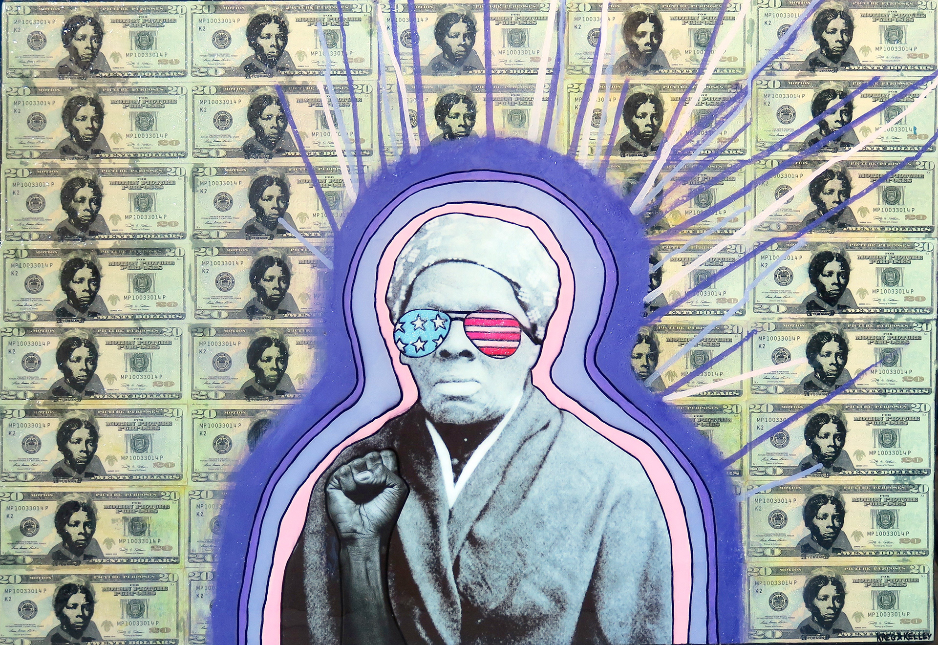 "Owed Debts: Homage To Harriet" Acrylic, Ink, Photograph of Harriet Tubman c.1895, Facsimile $20 Bill's with Tubman Stamp, Diamond Dust with Glossy Resin Glaze (shines like glass) on Canvas, 30 x 20 x 2”