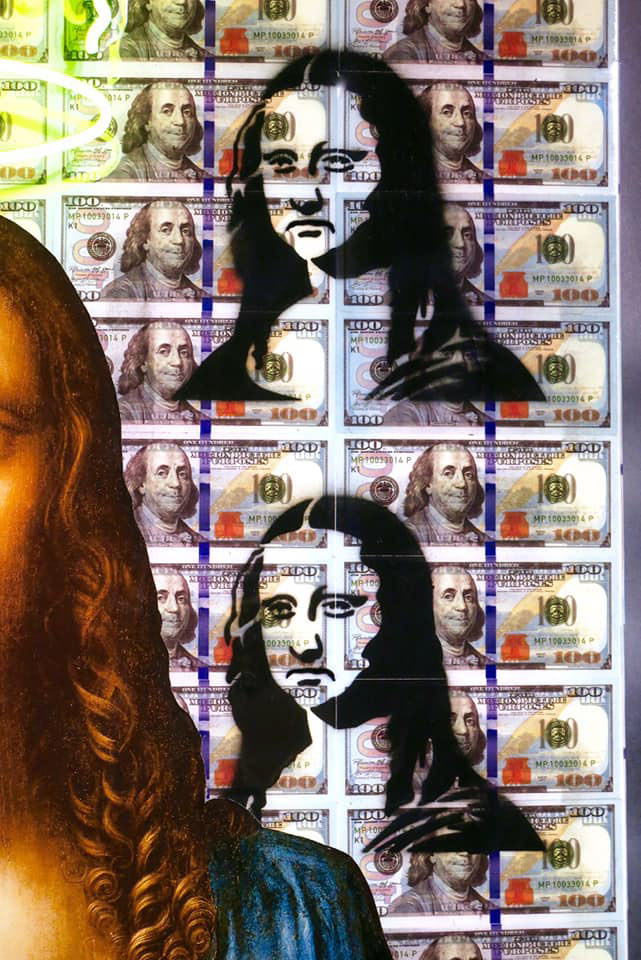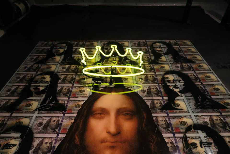 Acrylic, Ink, Neon Light (pops off canvas 4"), Facsimile of Leonardo da Vinci’s Painting Salvator Mundi (sold in 2017 for a record $450.3 million), Paper, Glossy Resin Glaze (shines like glass) on Canvas, 30 x 40 x 4”