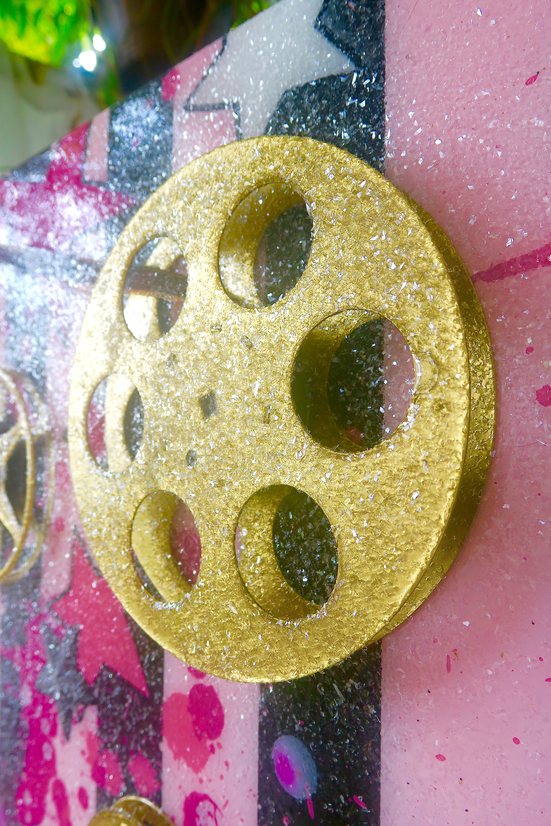 "A Star Is Born” Acrylic, Ink, Neon Light (two stars on lower left light up pink), Original Antique Metal Movie Reels c.1950s & 1960s, Antique Super 8 Film of "Gentlemen Prefer Blondes", Antique 16mm Film of "How To Marry A Millionaire", Antique 8mm Film of "The Seven Year Itch", Metal, Diamond Dust with Glossy Resin Glaze (shines like glass) on Aluminum, 37 x 64.5 x 4”