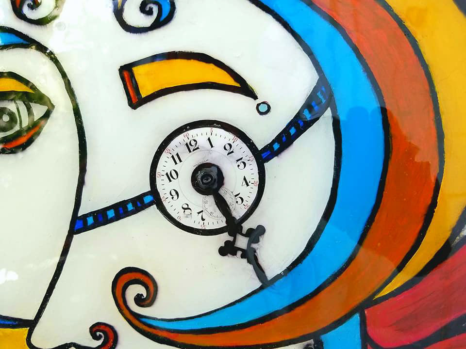 "The Key West Time Travelers" Acrylic, Ink, Pastel, Antique Clocks c.1890s, with Glossy Resin Glaze (shines like glass) on Canvas, 22 x 28 x 1.5"