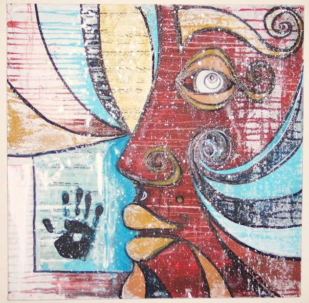 Oil, Acrylic, Paper Mache, Ink, & 4 Used Bullets (Eyes) with Glaze Finish on Canvas. c.2008, 30 x 30 inches (Sold)