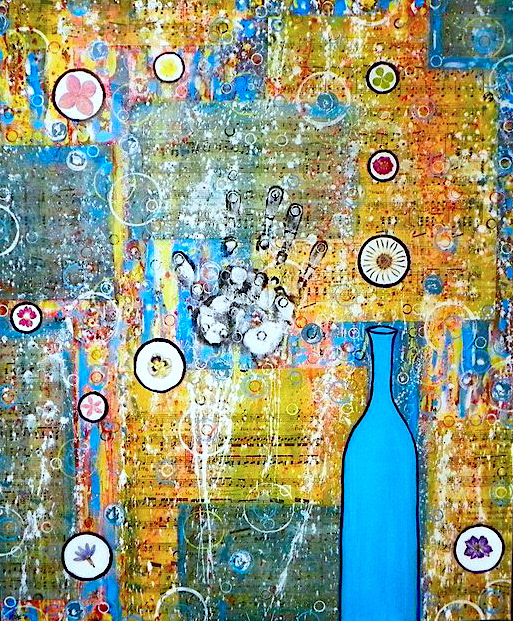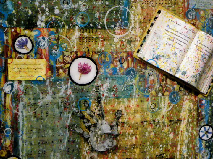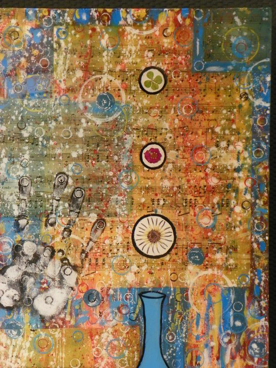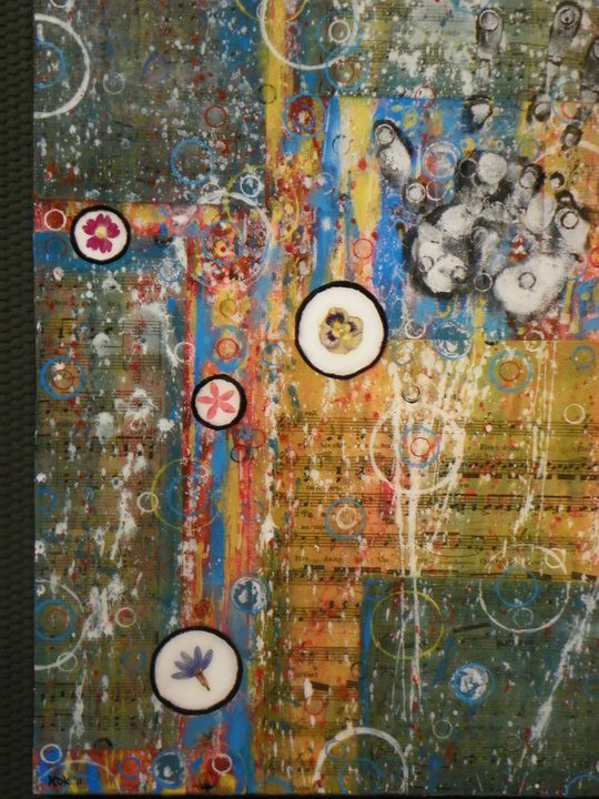 "Qui Habet Aures Audiendi Audiat I & II (He Who Has Ears To Hear Shall Hear) II" Acrylic, Ink, Pastel, Antique Sheet Music c.1875, Dried & Pressed Painted Flowers, Quote Book/Quotes from 'What Women Say About Men', on Canvas with Glossy Resin Glaze (shines like glass), 24x30" each, 48x60" overall