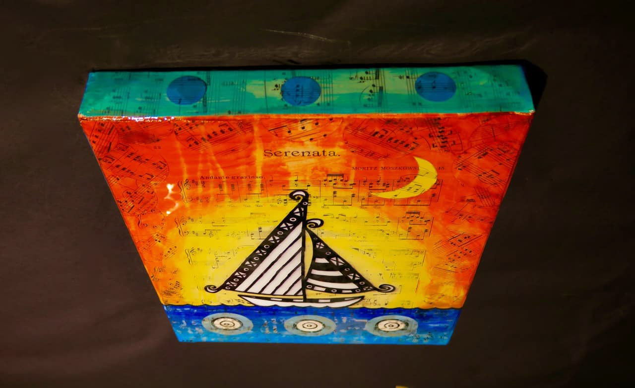 "Bene Ambula et Redambula (A Safe Journey To You)" Acrylic, Pastel, Ink, Antique Sheet Music c.1879 (clouds/boat/sails) , with Glossy Resin Glaze (shines like glass) on Canvas, 60x48x2"