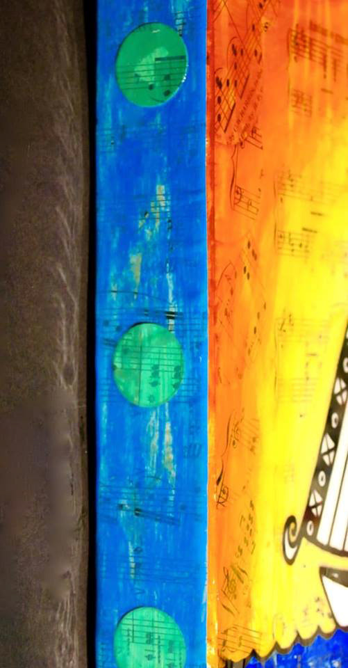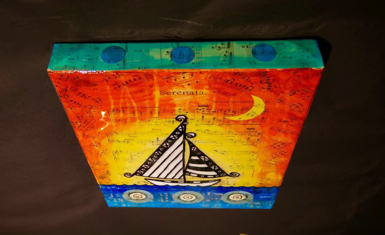"Serenata" Acrylic, Ink, Pastel, Antique Sheet Music from c. 1870s, w/ Resin Glaze on Canvas (shines like glass),