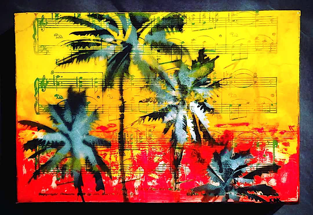 "Sunset Palms" Acrylic, Ink, Antique Sheet Music c.1906 on Canvas with Glossy Resin Glaze (shines like glass), 6x9x2" (Sold)
