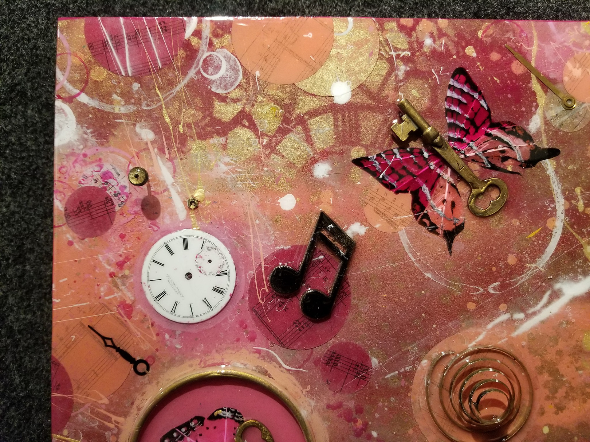 Acrylic, Ink, Antique Clocks & Porcelain Pocket Watch Parts, Sheet Music & Skeleton/Clock Keys c.1880s - early 1900s, Butterflies (hand painted feathers/paper), Battery Operated Clock Hands (working clock mechanism) with Glossy Archival ArtResin Glaze (shines like glass) on Wood, 18 x 12 x 2” SOLD
