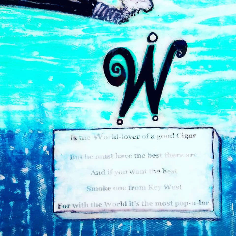 "Letter W (The Cigar Lover) ~ Based On The Original 1913 Key West Alphabet Sketch" Acrylic, Ink, on Canvas with Resin Glaze, 22x28x2" (Sold - On Permanent Exhibition at Seahorse Cove Guesthouse, Key West, FL). Created for the Florida Keys Council Of The Arts annual member's show "The Creative Art Of Lettering - Inspired By The Original 1913 Key West Alphabet By Andrew Pendleton" (see detailed images below) previously on display at the historic Gato Building, which was home to Key West's cigar making industry.