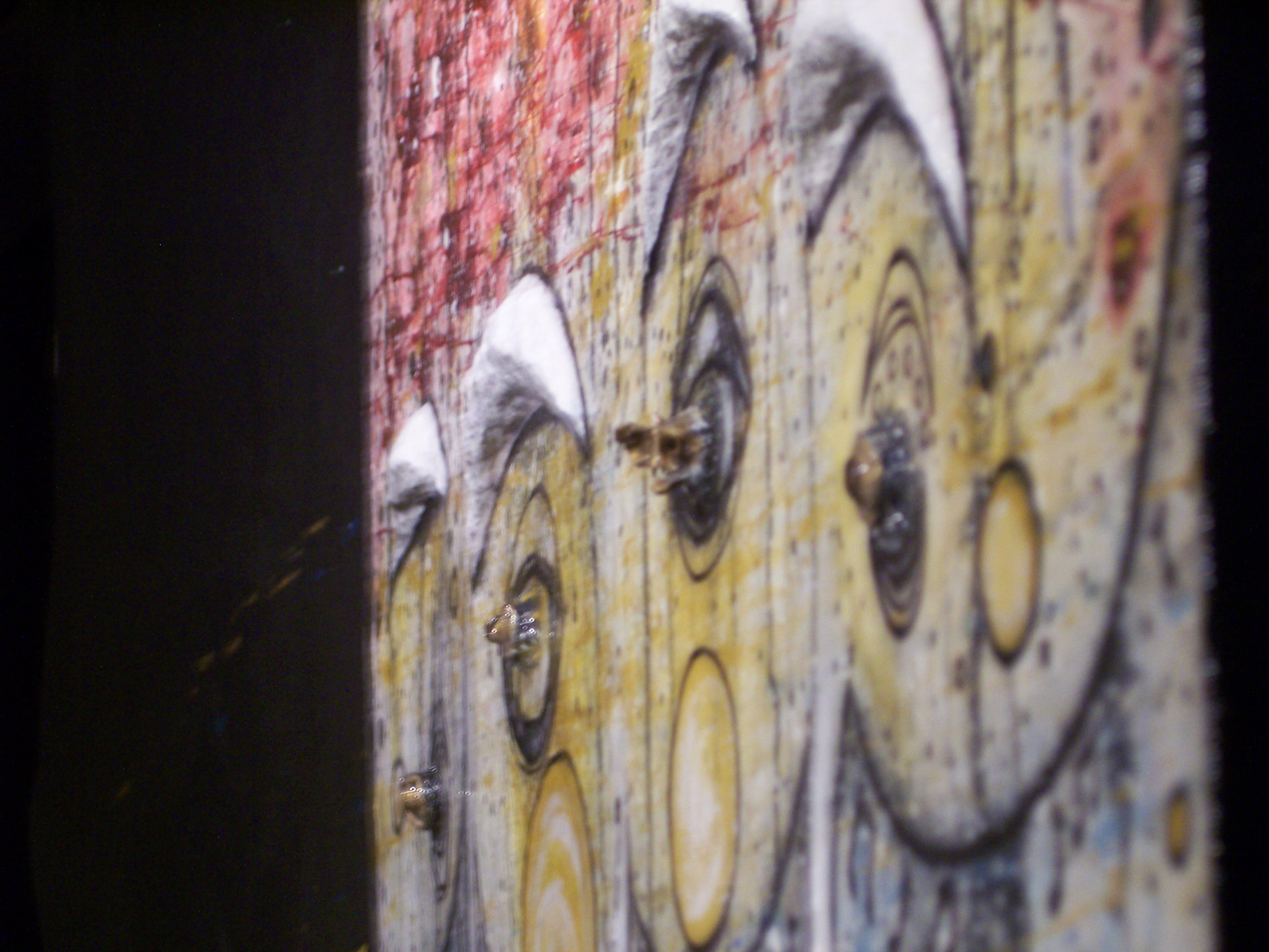 Oil, Acrylic, Paper Mache, Ink, & 4 Used Bullets (Eyes) with Glaze Finish on Canvas. c.2008, 30 x 30 inches (Sold)