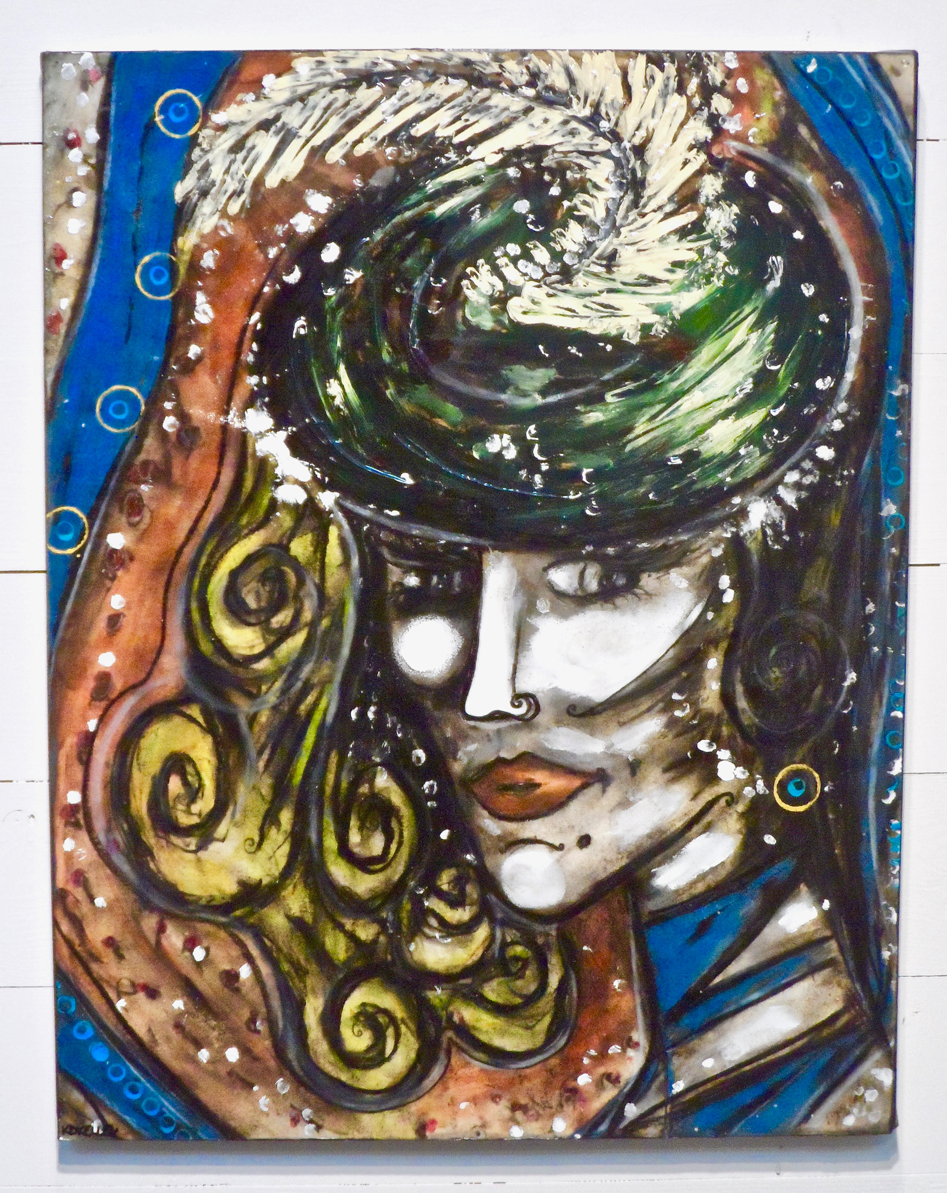 "The Spy (Marlene Dietrich)" Acrylic, Ink, Pastel, Oil with Glossy Resin Glaze (shines like glass) on Canvas, 22x28x2"